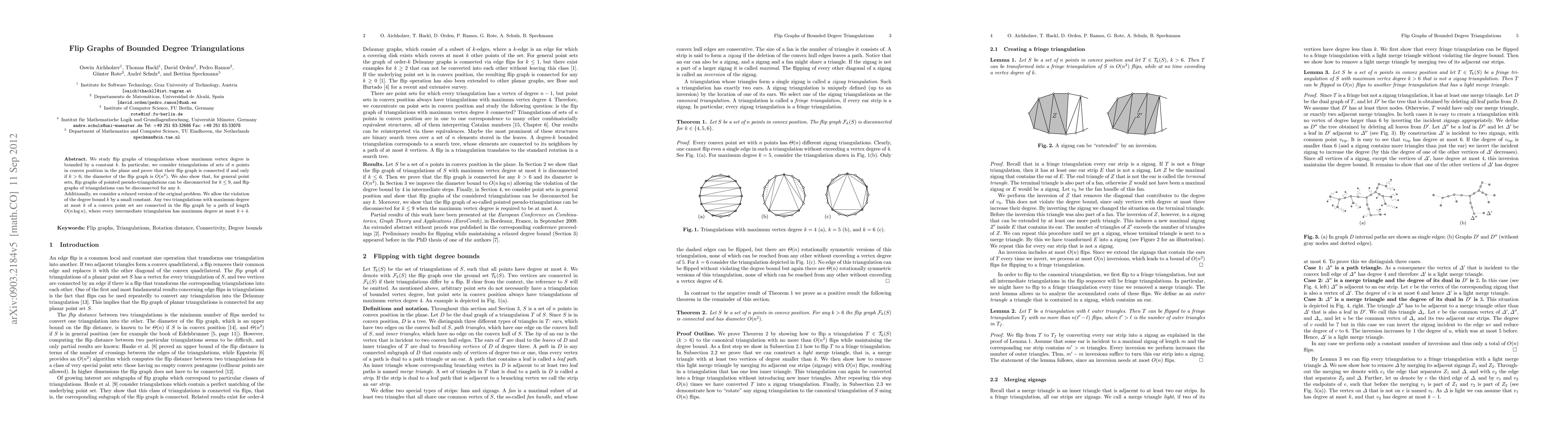 The work presents novel results on the flip graph of degree-bounded triangulations, including bounds on its connectivity and diameter.