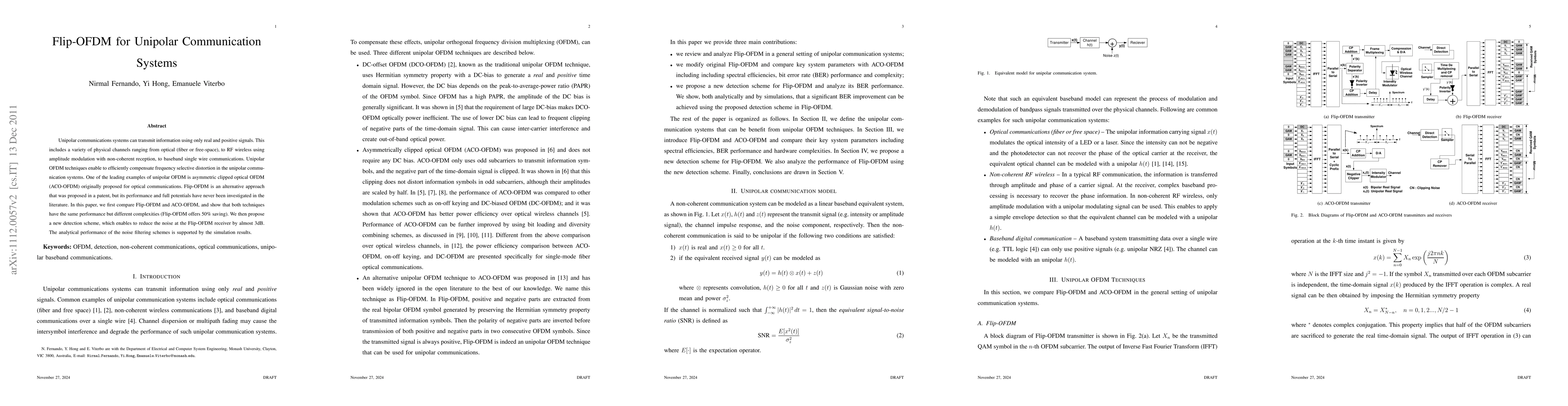 Unipolar communications systems can transmit information using only real and positive signals. This includes a variety of physical channels ranging from optical (fiber or free-space), to RF wireless using amplitude modulation with non-coherent reception, to baseband single wire communications. Unipolar OFDM techniques enable to efficiently compensate frequency selective distortion in the unipolar communication systems. One of the leading examples of unipolar OFDM is asymmetric clipped optical OFDM (ACO-OFDM) originally proposed for optical communications. Flip-OFDM is an alternative approach that was proposed in a patent, but its performance and full potentials have never been investigated in the literature. In this paper, we first compare Flip-OFDM and ACO-OFDM, and show that both techniques have the same performance but different complexities (Flip-OFDM offers 50% saving). We then propose a new detection scheme, which enables to reduce the noise at the Flip-OFDM receiver by almost 3dB. The analytical performance of the noise filtering schemes is supported by the simulation results.