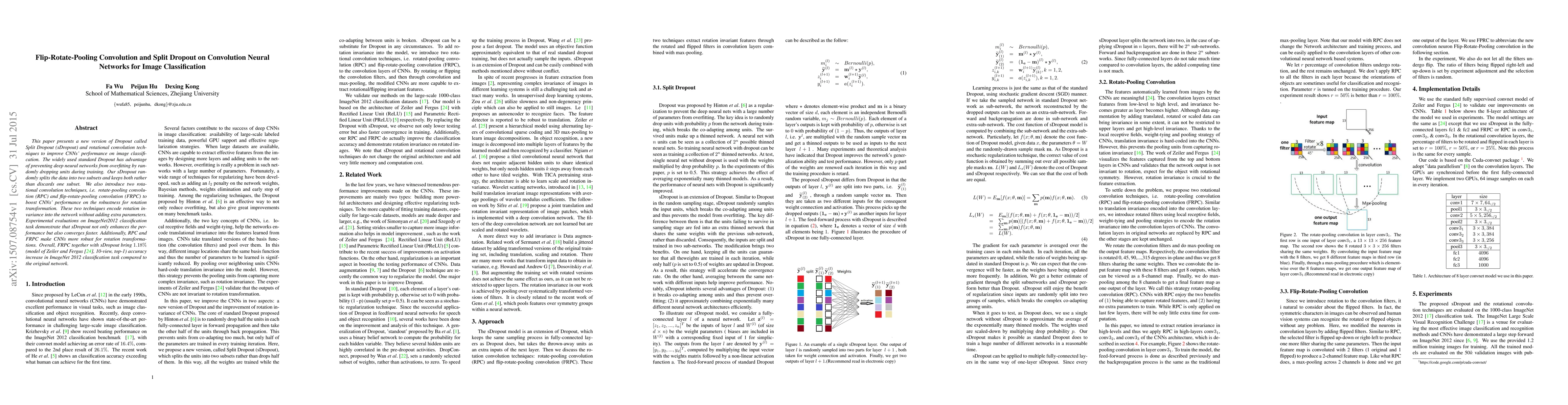 This paper introduces Split Dropout and rotational convolution techniques to enhance CNN performance for image classification. Split Dropout improves training efficiency and robustness, while rotate-pooling and flip-rotate-pooling convolutions boost rotation invariance without extra parameters, achieving a $1.18\%$ accuracy increase on ImageNet 2012.
