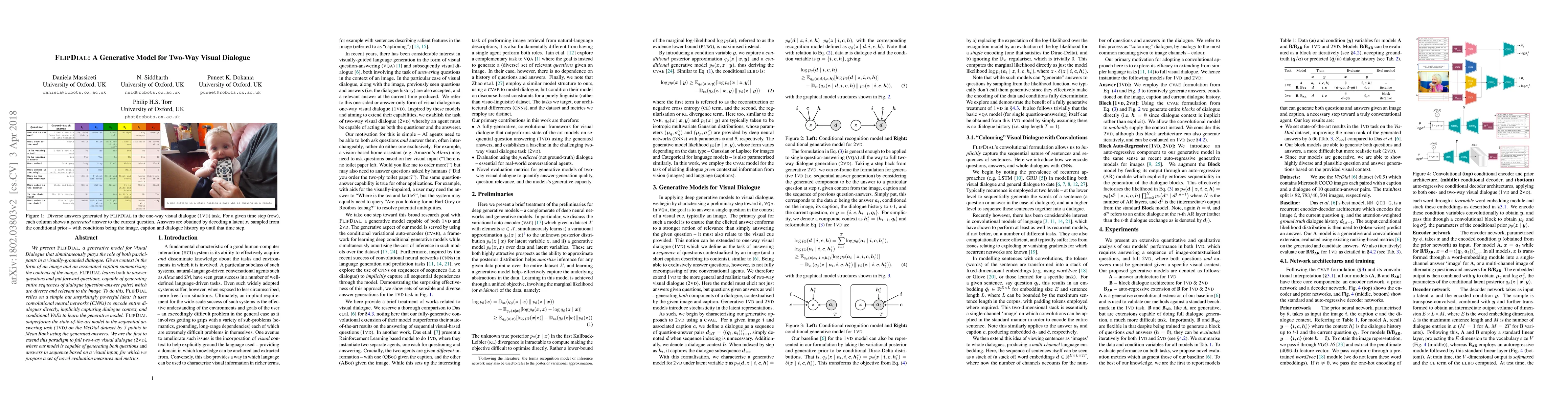FlipDial is a generative model for two-way visual dialogue that can both ask and answer questions based on visual context, outperforming existing models in sequential answering tasks. It employs CNNs and conditional VAEs to encode dialogues and generate diverse, relevant dialogue sequences.