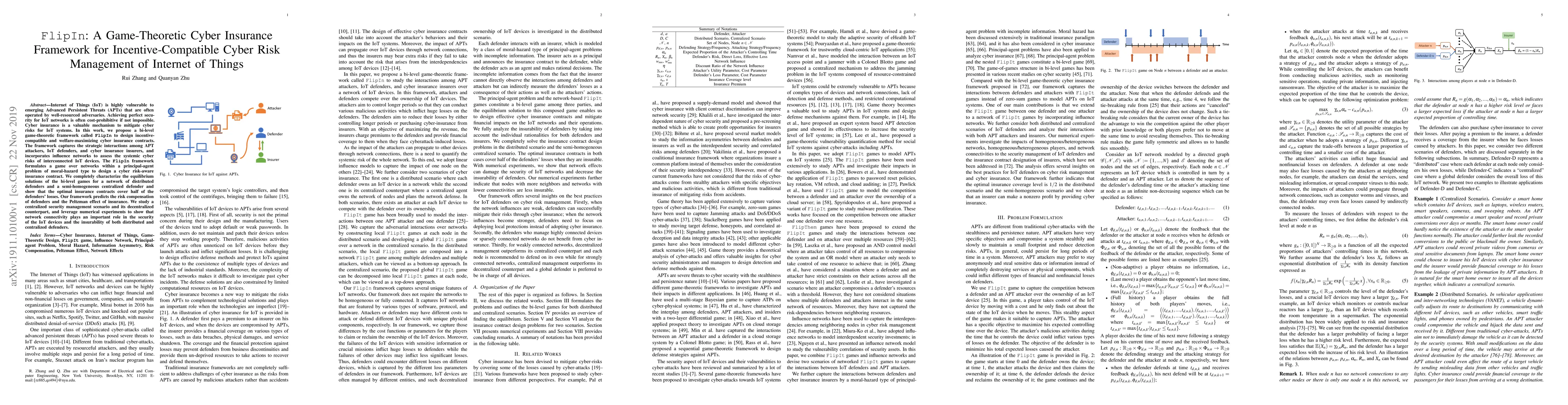 The FlipIn framework proposes a game-theoretic cyber insurance model for IoT risk management, balancing incentives for defenders while maximizing welfare. It characterizes equilibrium solutions for optimal insurance contracts that cover half of defenders' losses, highlighting the importance of network connectivity in security.
