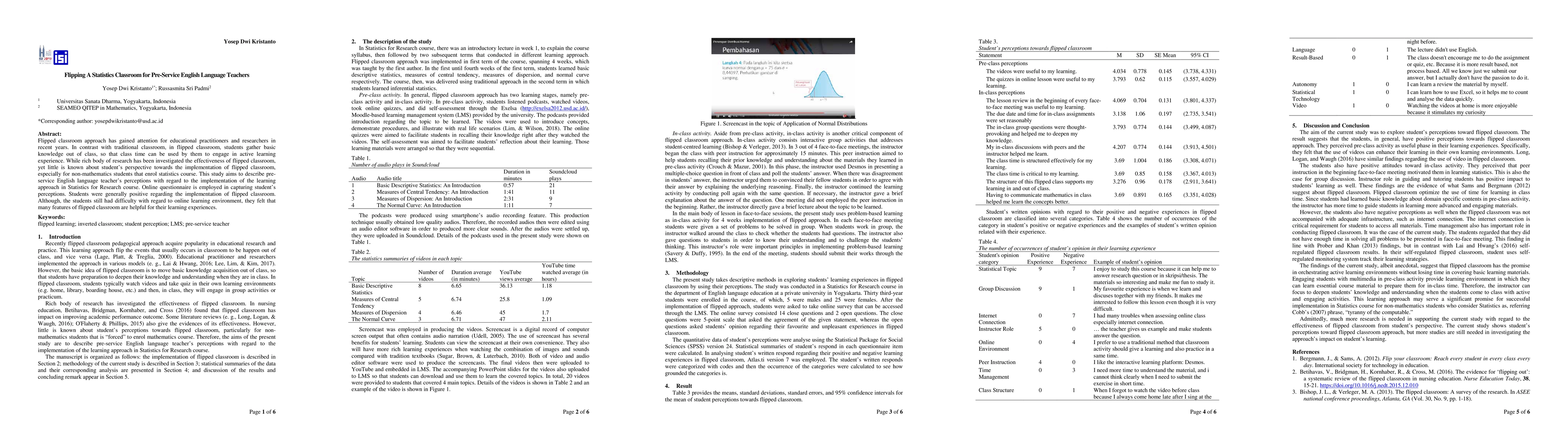 This study explores pre-service English language teachers' perceptions of a flipped classroom in a Statistics for Research course. Students reported generally positive views on the approach, despite some online learning challenges, and found several flipped classroom features beneficial to their learning.