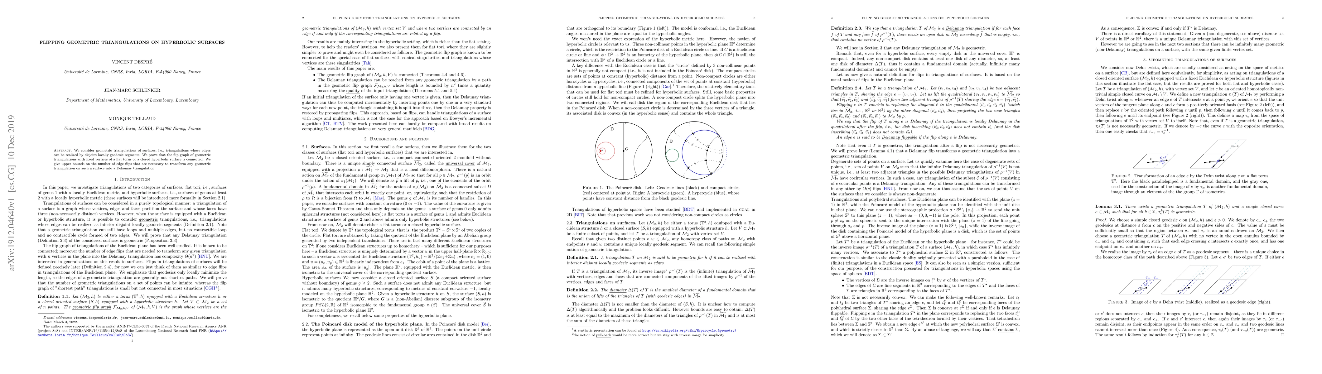 This paper demonstrates that the flip graph of geometric triangulations on a flat torus or a closed hyperbolic surface is connected, meaning any such triangulation can be transformed into another via a series of edge flips. It also provides an upper bound on the number of flips required to convert any geometric triangulation into a Delaunay triangulation.