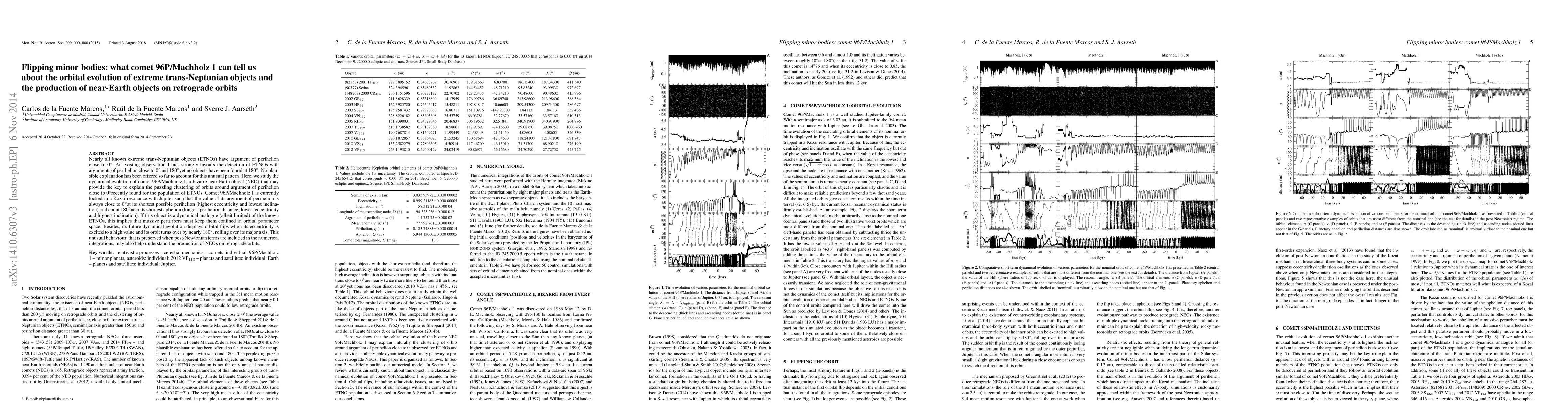 Nearly all known extreme trans-Neptunian objects (ETNOs) have argument of perihelion close to 0 degrees. An existing observational bias strongly favours the detection of ETNOs with arguments of perihelion close to 0 degrees and 180 degrees yet no objects have been found at 180 degrees. No plausible explanation has been offered so far to account for this unusual pattern. Here, we study the dynamical evolution of comet 96P/Machholz 1, a bizarre near-Earth object (NEO) that may provide the key to explain the puzzling clustering of orbits around argument of perihelion close to 0 degrees recently found for the population of ETNOs. Comet 96P/Machholz 1 is currently locked in a Kozai resonance with Jupiter such that the value of its argument of perihelion is always close to 0 degrees at its shortest possible perihelion (highest eccentricity and lowest inclination) and about 180 degrees near its shortest aphelion (longest perihelion distance, lowest eccentricity and highest inclination). If this object is a dynamical analogue (albeit limited) of the known ETNOs, this implies that massive perturbers must keep them confined in orbital parameter space. Besides, its future dynamical evolution displays orbital flips when its eccentricity is excited to a high value and its orbit turns over by nearly 180 degrees, rolling over its major axis. This unusual behaviour, that is preserved when post-Newtonian terms are included in the numerical integrations, may also help understand the production of NEOs on retrograde orbits.
