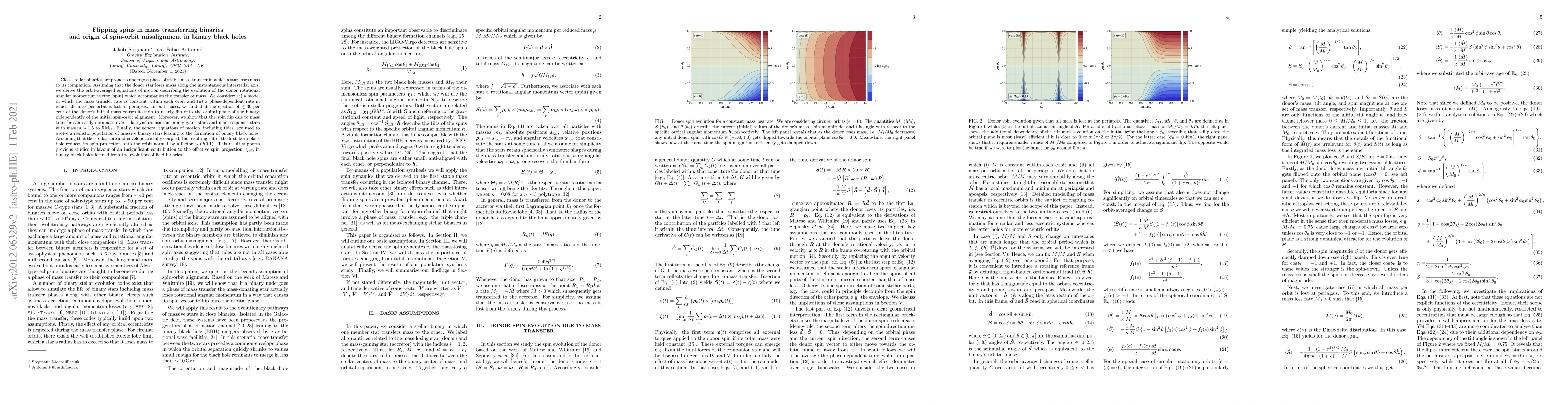 Close stellar binaries are prone to undergo a phase of stable mass transfer in which a star loses mass to its companion. Assuming that the donor star loses mass along the instantaneous interstellar axis, we derive the orbit-averaged equations of motion describing the evolution of the donor rotational angular momentum vector (spin) which accompanies the transfer of mass. We consider: (i) a model in which the mass transfer rate is constant within each orbit and (ii) a phase-dependent rate in which all mass per orbit is lost at periapsis. In both cases, we find that the ejection of $\gtrsim 30$ per cent of the donor's initial mass causes its spin to nearly flip onto the orbital plane of the binary, independently of the initial spin-orbit alignment. Moreover, we show that the spin flip due to mass transfer can easily dominate over tidal synchronisation in any giant stars and main-sequence stars with masses $\sim1.5$ to $5\,\rm M_\odot$. Finally, the general equations of motion, including tides, are used to evolve a realistic population of massive binary stars leading to the formation of binary black holes. Assuming that the stellar core and envelope are fully coupled, the resulting tilt of the first-born black hole reduces its spin projection onto the orbit normal by a factor $\sim\mathcal{O}(0.1)$. This result supports previous studies in favour of an insignificant contribution to the effective spin projection, $\chi_{\rm eff}$, in binary black holes formed from the evolution of field binaries.