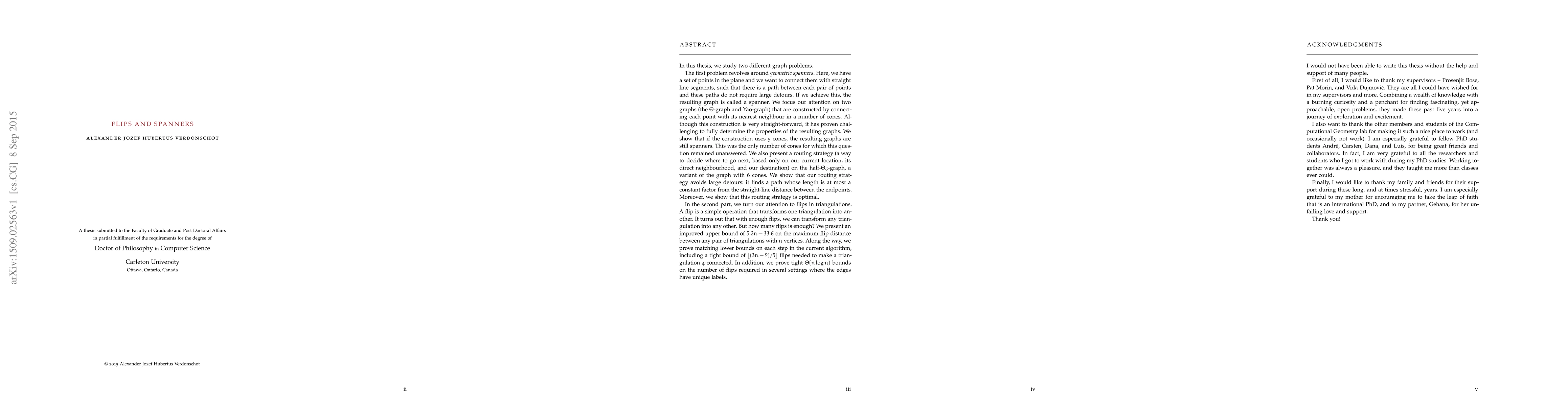 In this thesis, we study two different graph problems. The first problem revolves around geometric spanners. Here, we have a set of points in the plane and we want to connect them with straight line segments, such that there is a path between each pair of points that does not make a large detour. If we achieve this, the resulting graph is called a spanner. We focus our attention on $\Theta$-graphs, which are constructed by connecting each point with its nearest neighbour in a fixed number of cones. Although this construction is very straight-forward, it has proven challenging to fully determine the properties of the resulting graphs. We show that if the construction uses 5 cones, the resulting graphs are still spanners. This was the only number of cones for which this question remained unanswered. We also present a routing strategy on the half-$\Theta_6$-graph, a variant of the graph with 6 cones. We show that our routing strategy finds a path whose length is at most a constant factor from the straight-line distance between the endpoints. Moreover, we show that this routing strategy is optimal. In the second part, we turn our attention to flips in triangulations. A flip is a simple operation that transforms one triangulation into another. It turns out that with enough flips, we can transform any triangulation into any other. But how many flips is enough? We present an improved upper bound of $5.2n - 33.6$ on the maximum flip distance between any pair of triangulations with n vertices. Along the way, we prove matching lower bounds on each step in the current algorithm, including a tight bound of $(3n - 9)/5$ flips needed to make a triangulation 4-connected. In addition, we prove tight $\Theta(n \log n)$ bounds on the number of flips required in several settings where the edges have unique labels.