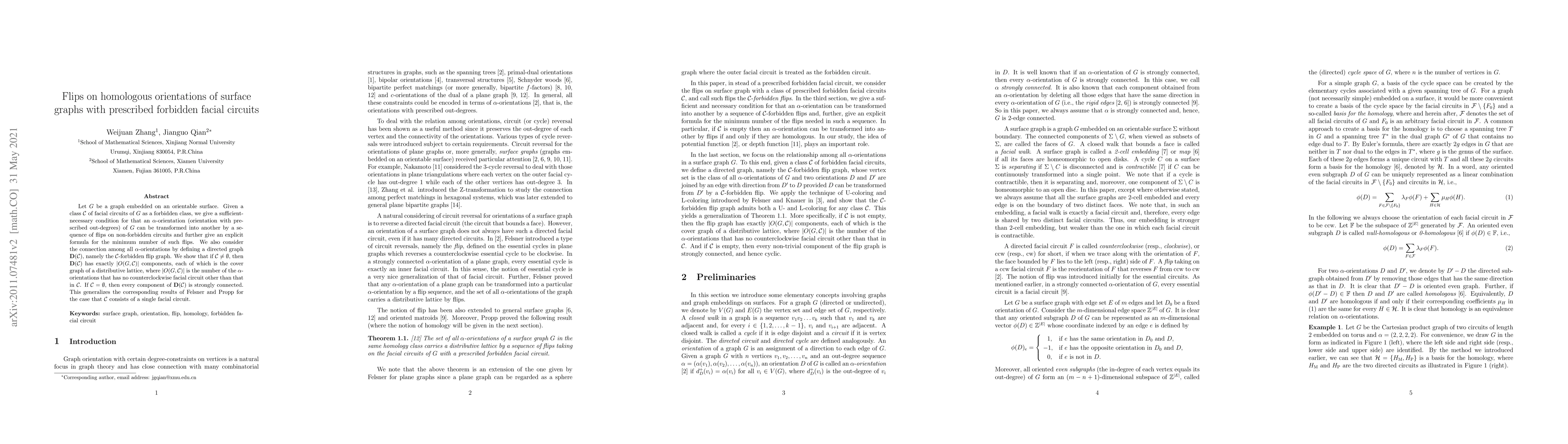 Let $G$ be a graph embedded on an orientable surface. Given a class ${\cal C}$ of facial circuits of $G$ as a forbidden class, we give a sufficient-necessary condition for that an $\alpha$-orientation (orientation with prescribed out-degrees) of $G$ can be transformed into another by a sequence of flips on non-forbidden circuits and further give an explicit formula for the minimum number of such flips. We also consider the connection among all $\alpha$-orientations by defining a directed graph ${\bf D}({\cal C})$, namely the ${\cal C}$-forbidden flip graph. We show that if ${\cal C}\not=\emptyset$, then ${\bf D}({\cal C})$ has exactly $|O(G,{\cal C})|$ components, each of which is the cover graph of a distributive lattice, where $|O(G,{\cal C})|$ is the number of the $\alpha$-orientations that has no counterclockwise facial circuit other than that in ${\cal C}$. If ${\cal C}=\emptyset$, then every component of ${\bf D}({\cal C})$ is strongly connected. This generalizes the corresponding results of Felsner and Propp for the case that ${\cal C}$ consists of a single facial circuit.