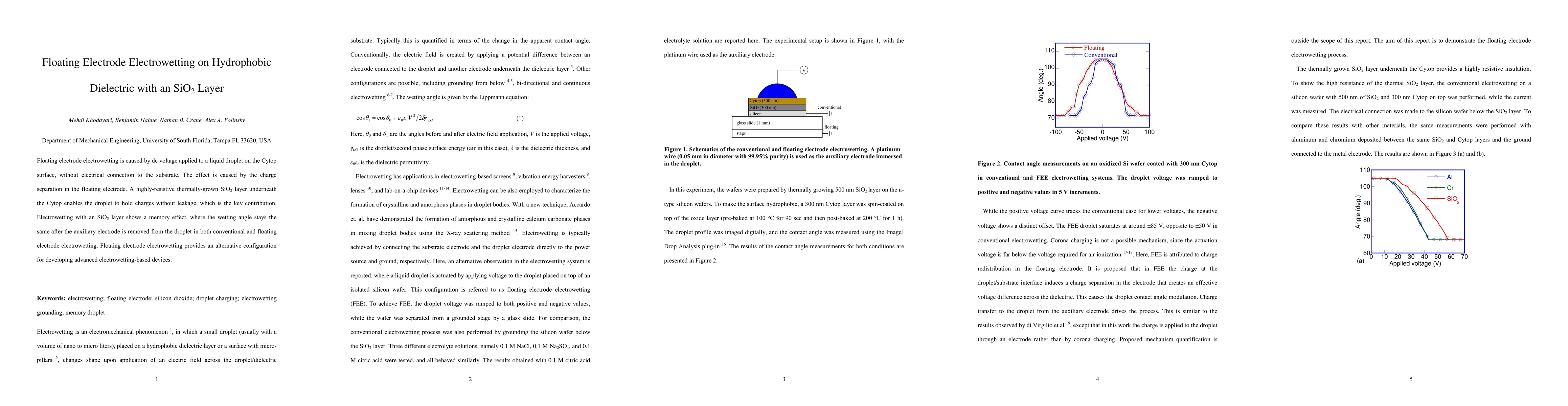 Summary: This paper explores floating electrode electrowetting on a hydrophobic Cytop surface with an underlying SiO2 layer, demonstrating charge retention without leakage. The SiO2 layer enables a memory effect in electrowetting, maintaining the wetting angle even after voltage removal, offering a novel approach for advanced electrowetting devices.