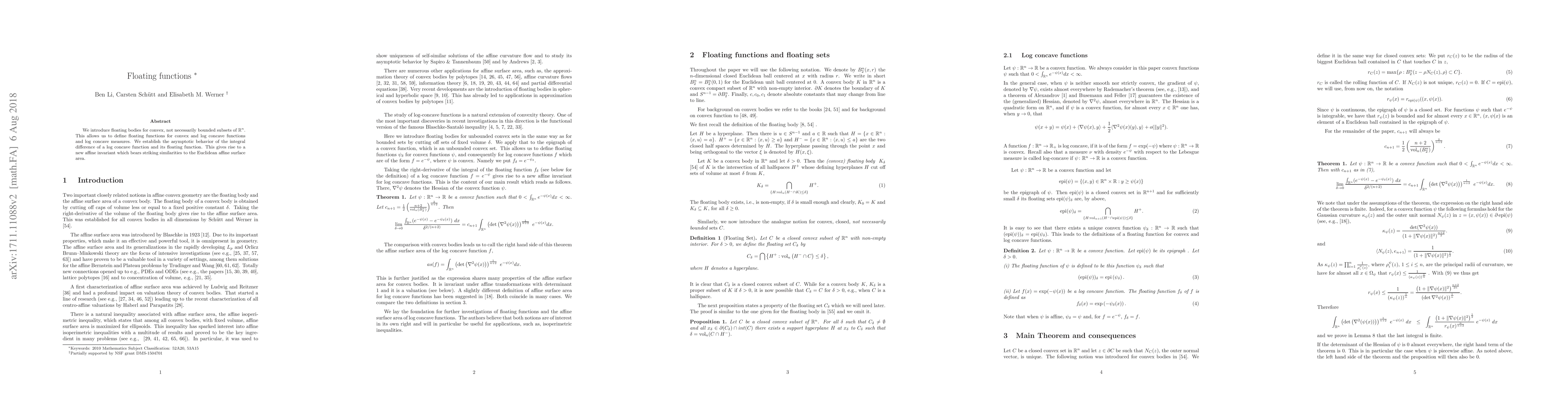 Summary: Floating bodies for convex subsets in $\mathbb{R}^n$ are introduced, enabling the definition of floating functions for convex and log concave functions. The paper establishes the asymptotic behavior of the integral difference between a log concave function and its floating function, revealing a new affine invariant akin to the Euclidean affine surface area.