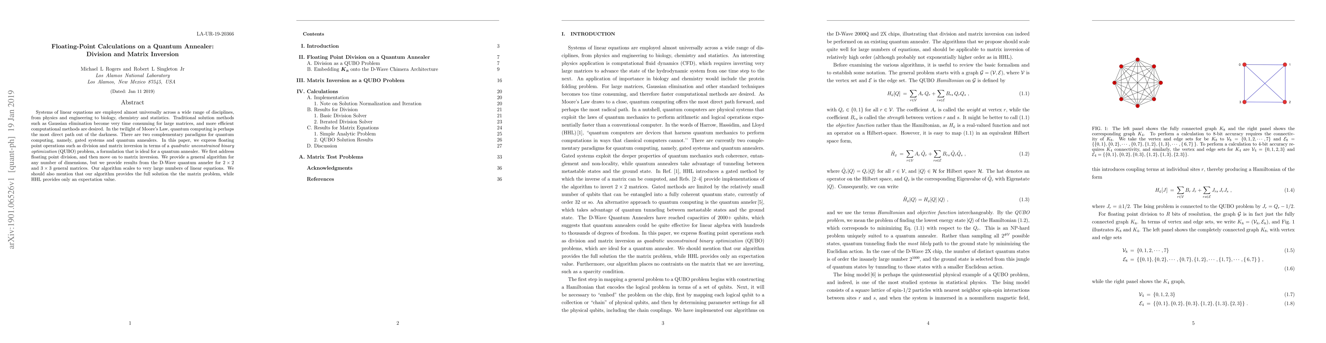 Systems of linear equations are employed almost universally across a wide range of disciplines, from physics and engineering to biology, chemistry and statistics. Traditional solution methods such as Gaussian elimination become very time consuming for large matrices, and more efficient computational methods are desired. In the twilight of Moore's Law, quantum computing is perhaps the most direct path out of the darkness. There are two complementary paradigms for quantum computing, namely, gated systems and quantum annealers. In this paper, we express floating point operations such as division and matrix inversion in terms of a quadratic unconstrained binary optimization (QUBO) problem, a formulation that is ideal for a quantum annealer. We first address floating point division, and then move on to matrix inversion. We provide a general algorithm for any number of dimensions, but we provide results from the D-Wave quantum anneler for $2\times 2$ and $3 \times 3$ general matrices. Our algorithm scales to very large numbers of linear equations. We should also mention that our algorithm provides the full solution the the matrix problem, while HHL provides only an expectation value.