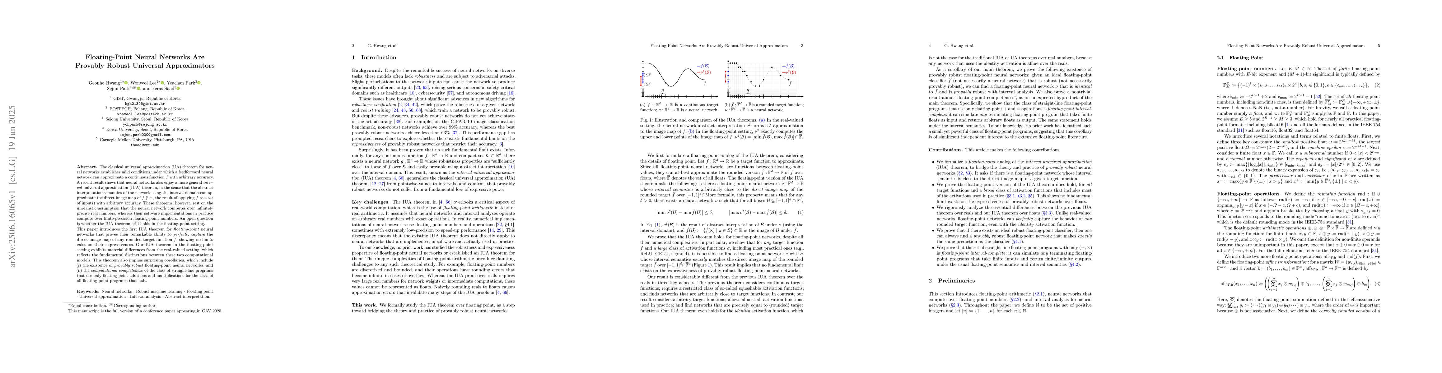 The classical universal approximation (UA) theorem for neural networks establishes mild conditions under which a feedforward neural network can approximate a continuous function $f$ with arbitrary accuracy. A recent result shows that neural networks also enjoy a more general interval universal approximation (IUA) theorem, in the sense that the abstract interpretation semantics of the network using the interval domain can approximate the direct image map of $f$ (i.e., the result of applying $f$ to a set of inputs) with arbitrary accuracy. These theorems, however, rest on the unrealistic assumption that the neural network computes over infinitely precise real numbers, whereas their software implementations in practice compute over finite-precision floating-point numbers. An open question is whether the IUA theorem still holds in the floating-point setting. This paper introduces the first IUA theorem for floating-point neural networks that proves their remarkable ability to perfectly capture the direct image map of any rounded target function $f$, showing no limits exist on their expressiveness. Our IUA theorem in the floating-point setting exhibits material differences from the real-valued setting, which reflects the fundamental distinctions between these two computational models. This theorem also implies surprising corollaries, which include (i) the existence of provably robust floating-point neural networks; and (ii) the computational completeness of the class of straight-line programs that use only floating-point additions and multiplications for the class of all floating-point programs that halt.