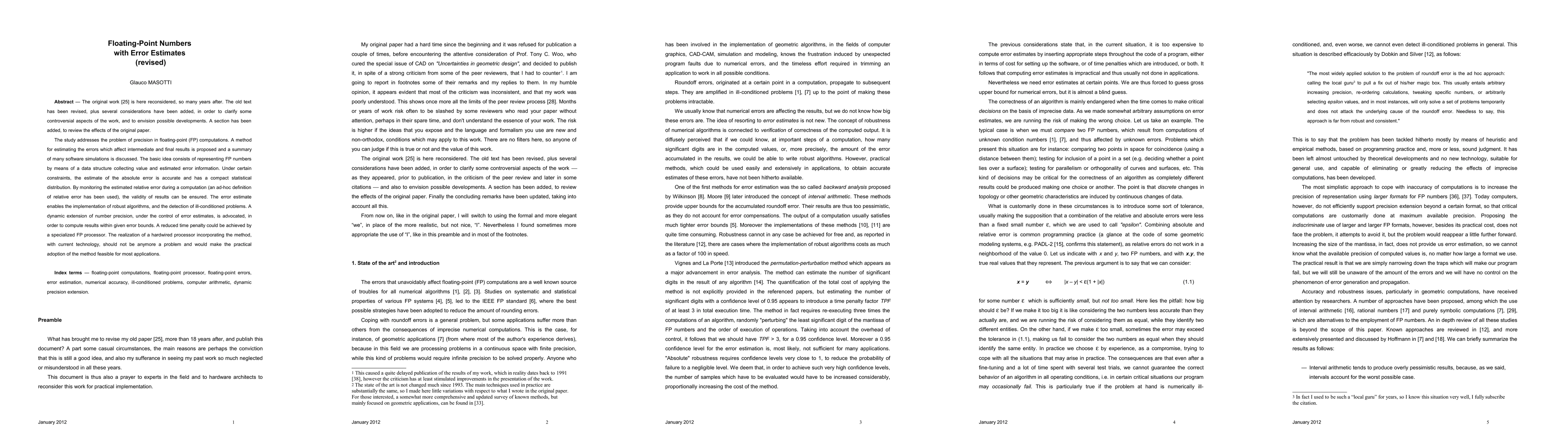 The study addresses the problem of precision in floating-point (FP) computations. A method for estimating the errors which affect intermediate and final results is proposed and a summary of many software simulations is discussed. The basic idea consists of representing FP numbers by means of a data structure collecting value and estimated error information. Under certain constraints, the estimate of the absolute error is accurate and has a compact statistical distribution. By monitoring the estimated relative error during a computation (an ad-hoc definition of relative error has been used), the validity of results can be ensured. The error estimate enables the implementation of robust algorithms, and the detection of ill-conditioned problems. A dynamic extension of number precision, under the control of error estimates, is advocated, in order to compute results within given error bounds. A reduced time penalty could be achieved by a specialized FP processor. The realization of a hardwired processor incorporating the method, with current technology, should not be anymore a problem and would make the practical adoption of the method feasible for most applications.