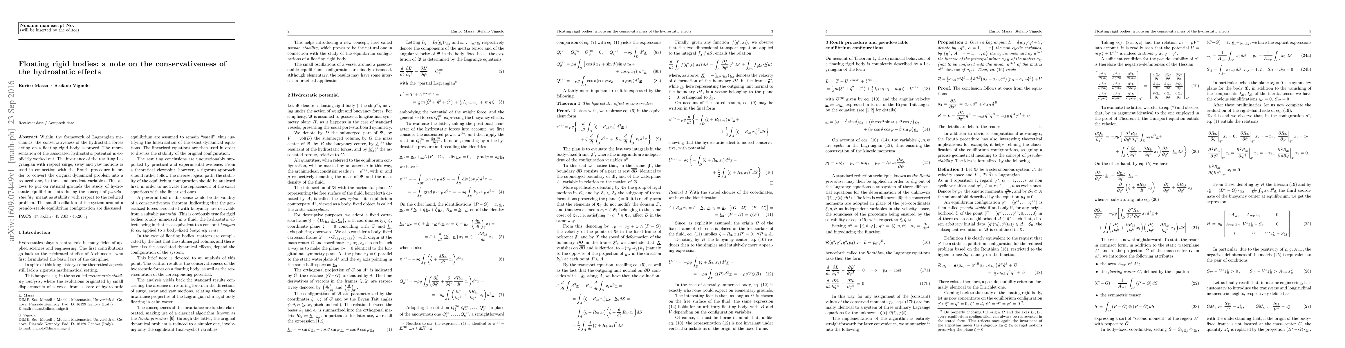 Within the framework of Lagrangian mechanics, the conservativeness of the hydrostatic forces acting on a floating rigid body is proved. The representation of the associated hydrostatic potential is explicitly worked out. The invariance of the resulting Lagrangian with respect surge, sway and yaw motions is used in connection with the Routh procedure in order to convert the original dynamical problem into a reduced one, in three independent variables. This allows to put on rational grounds the study of hydrostatic equilibrium, introducing the concept of pseudo--stability, meant as stability with respect to the reduced problem. The small oscillations of the system around a pseudo-stable equilibrium configuration are discussed.