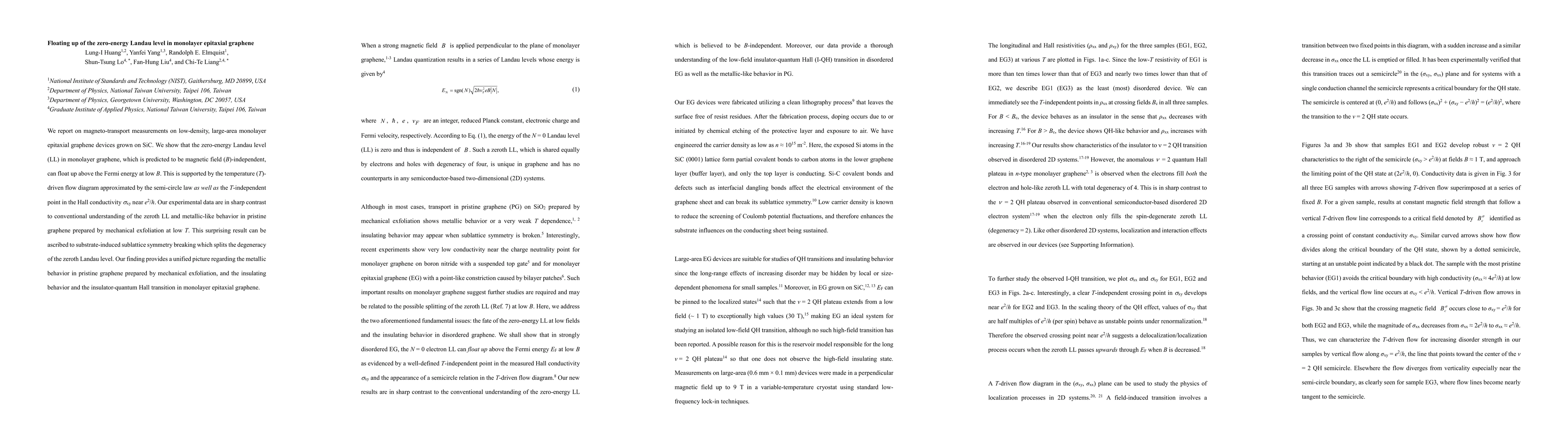 We report on magneto-transport measurements on low-density, large-area monolayer epitaxial graphene devices grown on SiC. We show that the zero-energy Landau level (LL) in monolayer graphene, which is predicted to be magnetic field ($B$)-independent, can float up above the Fermi energy at low $B$. This is supported by the temperature ($T$)-driven flow diagram approximated by the semi-circle law as well as the $T$-independent point in the Hall conductivity $\sigma_{xy}$ near $e^2/h$. Our experimental data are in sharp contrast to conventional understanding of the zeroth LL and metallic-like behavior in pristine graphene prepared by mechanical exfoliation at low $T$. This surprising result can be ascribed to substrate-induced sublattice symmetry breaking which splits the degeneracy of the zeroth Landau level. Our finding provides a unified picture regarding the metallic behavior in pristine graphene prepared by mechanical exfoliation, and the insulating behavior and the insulator-quantum Hall transition in monolayer epitaxial graphene.