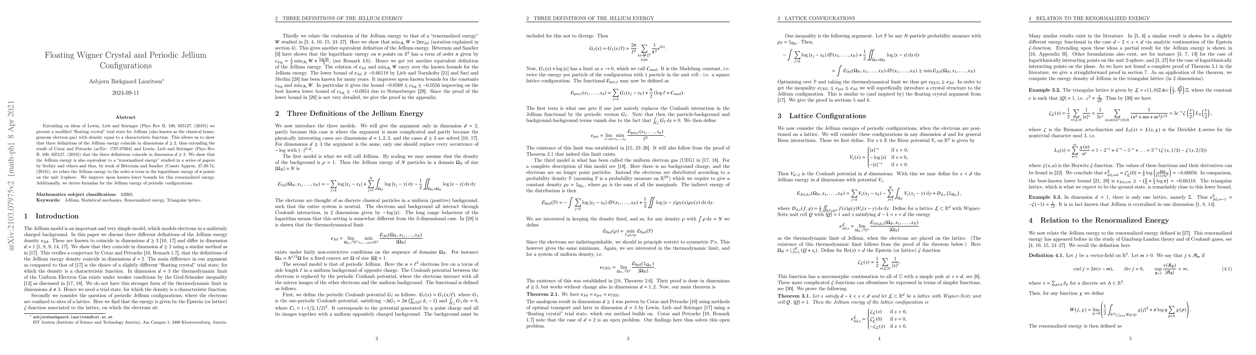 This paper presents a modified "floating crystal" trial state for Jellium, demonstrating that three definitions of the Jellium energy coincide in dimensions $d \geq 2$. It also relates the Jellium energy to the logarithmic energy of points on the unit 2-sphere and improves lower bounds for a renormalized energy.