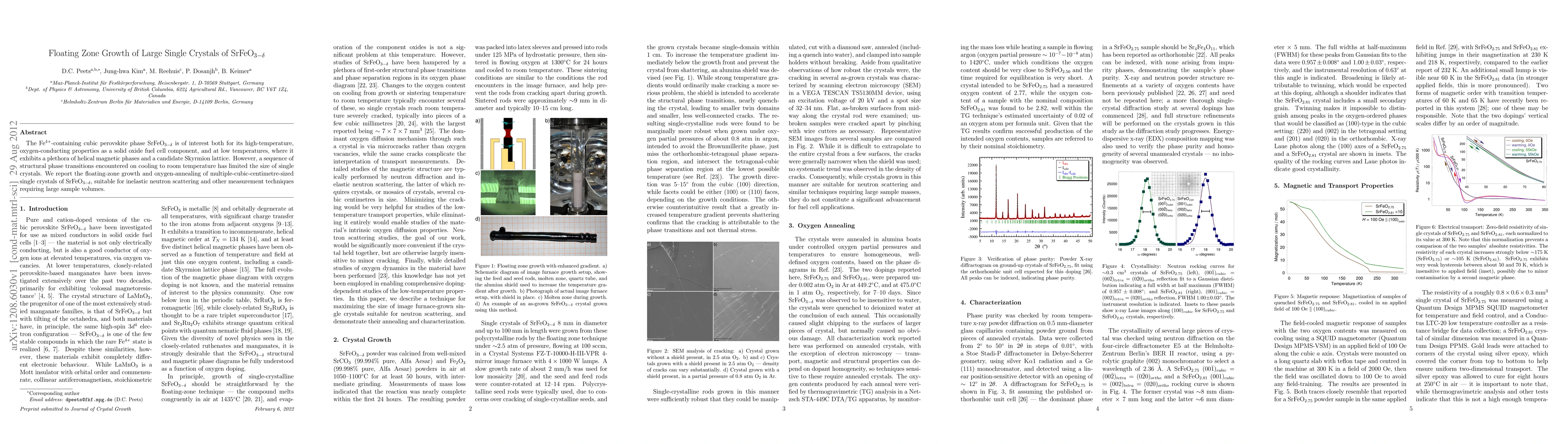 Researchers successfully grew large single crystals of SrFeO_3-x using floating-zone growth, enabling inelastic neutron scattering studies for a material with potential Skyrmion lattice properties.