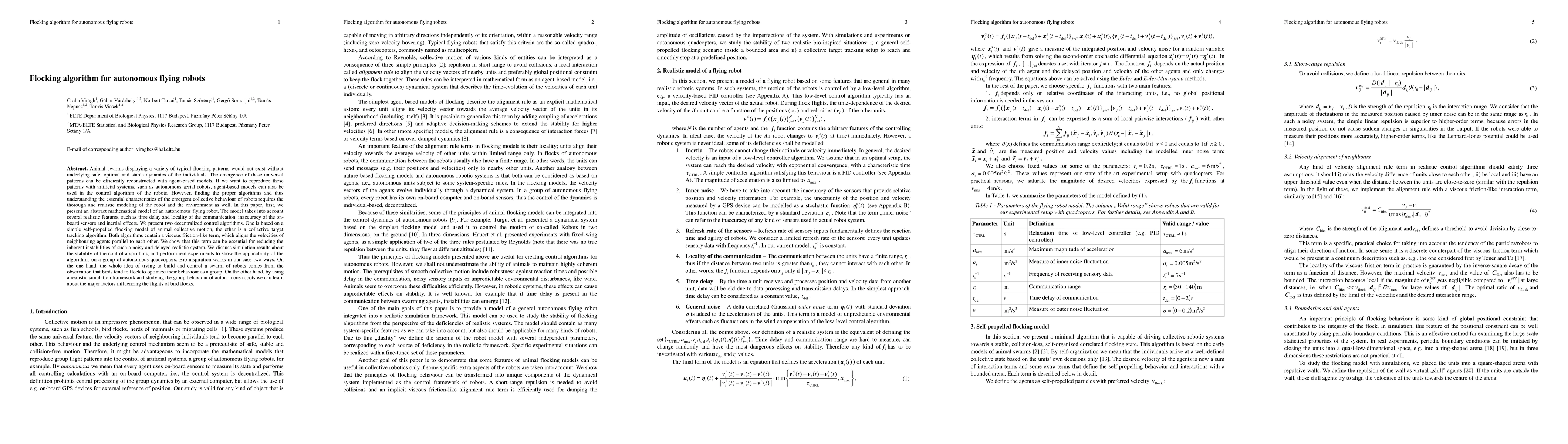 This paper presents a mathematical model for autonomous flying robots, incorporating realistic features like time delay and sensor inaccuracies. It introduces two decentralized control algorithms for flocking and target tracking, emphasizing the importance of a viscous friction-like term for stability. Simulation and real-world experiments with quadcopters demonstrate the algorithms' effectiveness.