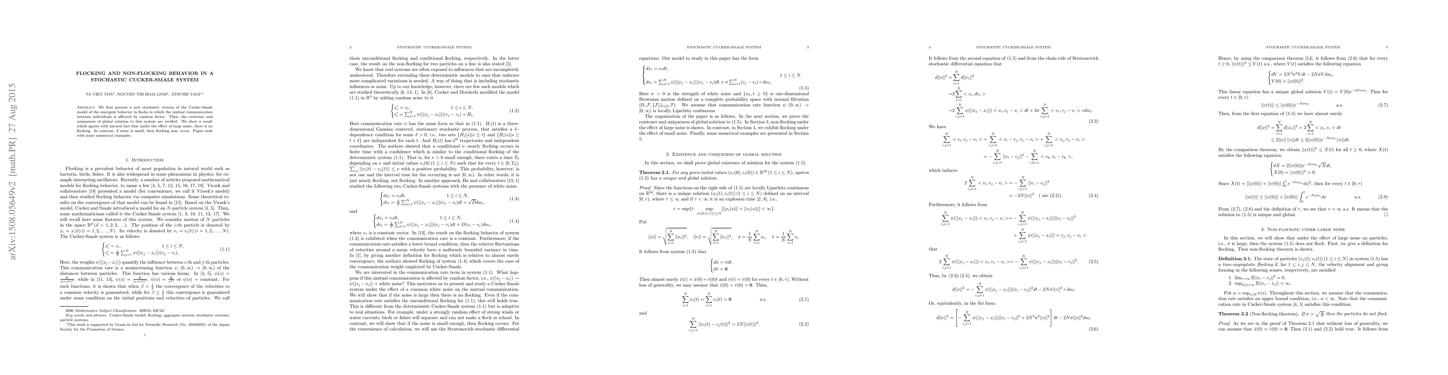 We first present a new stochastic version of the Cucker-Smale model of the emergent behavior in flocks in which the mutual communication between individuals is affected by random factor. Then, the existence and uniqueness of global solution to this system are verified. We show a result which agrees with natural fact that under the effect of large noise, there is no flocking. In contrast, if noise is small, then flocking may occur. Paper ends with some numerical examples.