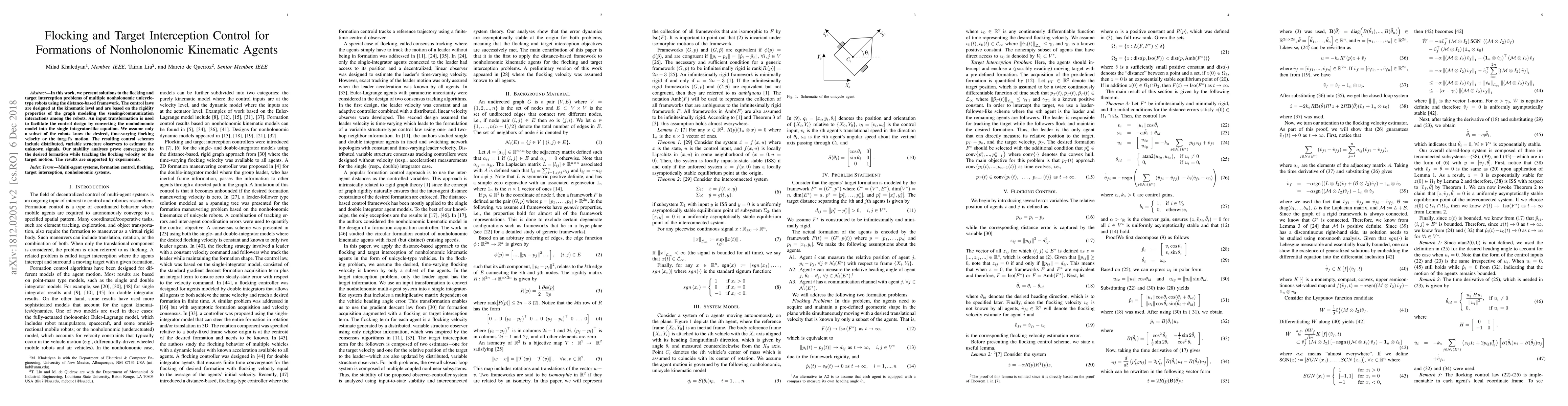 This paper presents control strategies for flocking and target interception of nonholonomic unicycle robots, utilizing a distance-based framework and graph rigidity. The control laws convert the nonholonomic model into an integrator-like equation, enabling distributed, variable structure observers for estimating unknown signals, with stability analyses proving convergence to desired formation.