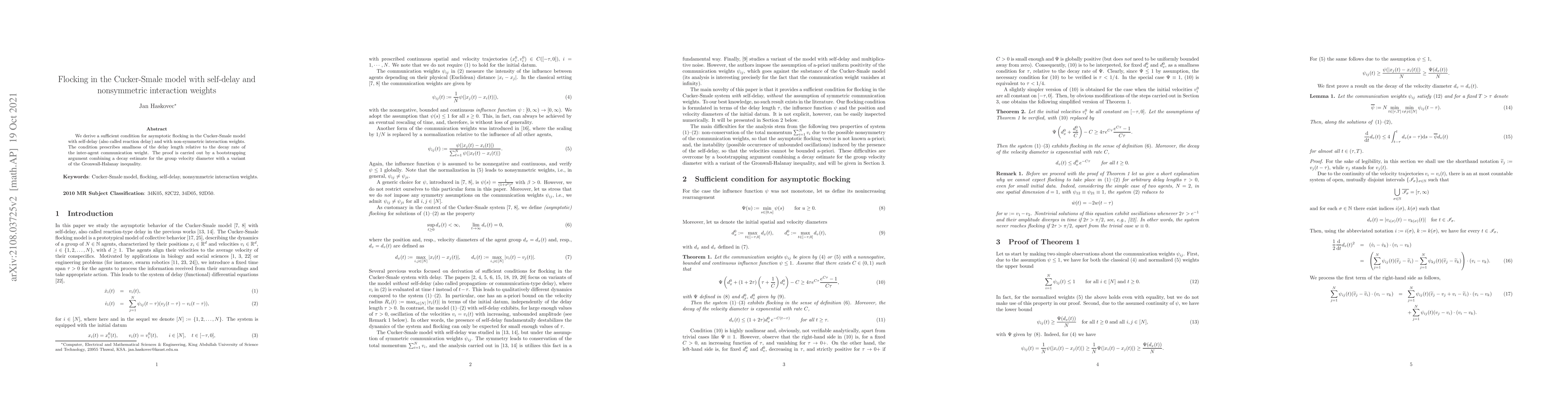 We derive a sufficient condition for asymptotic flocking in the Cucker-Smale model with self-delay (also called reaction delay) and with non-symmetric interaction weights. The condition prescribes smallness of the delay length relative to the decay rate of the inter-agent communication weight. The proof is carried out by a bootstrapping argument combining a decay estimate for the group velocity diameter with a variant of the Gronwall-Halanay inequality.
