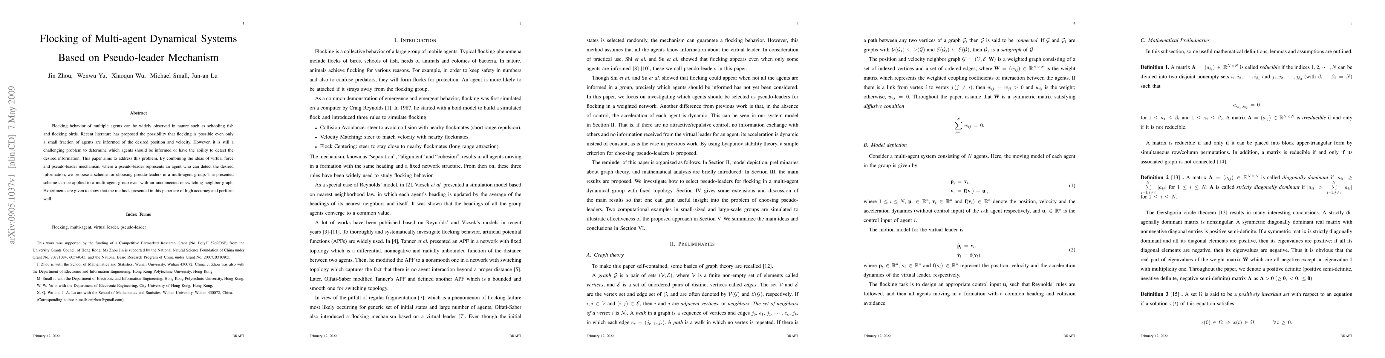 Flocking behavior of multiple agents can be widely observed in nature such as schooling fish and flocking birds. Recent literature has proposed the possibility that flocking is possible even only a small fraction of agents are informed of the desired position and velocity. However, it is still a challenging problem to determine which agents should be informed or have the ability to detect the desired information. This paper aims to address this problem. By combining the ideas of virtual force and pseudo-leader mechanism, where a pseudo-leader represents an agent who can detect the desired information, we propose a scheme for choosing pseudo-leaders in a multi-agent group. The presented scheme can be applied to a multi-agent group even with an unconnected or switching neighbor graph. Experiments are given to show that the methods presented in this paper are of high accuracy and perform well.