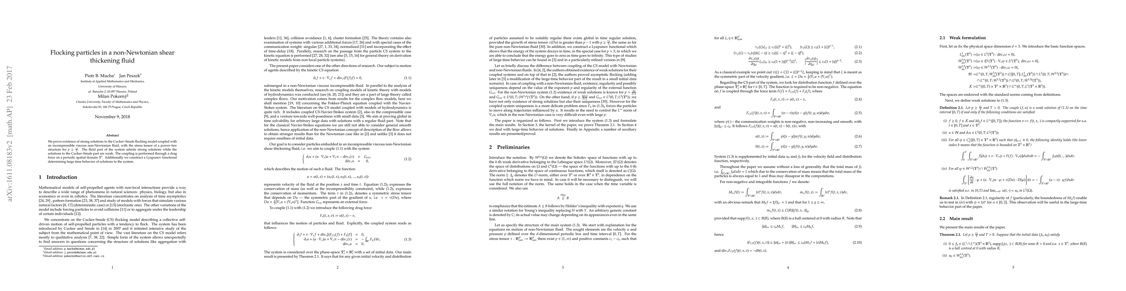 We prove existence and uniqueness of strong solutions to the Cucker--Smale flocking model coupled with an incompressible viscous non-Newtonian fluid, with the stress tensor of a power--law structure for $p\geq\frac{11}{5}$. The coupling is performed through a drag force on a periodic spatial domain $T^3$.