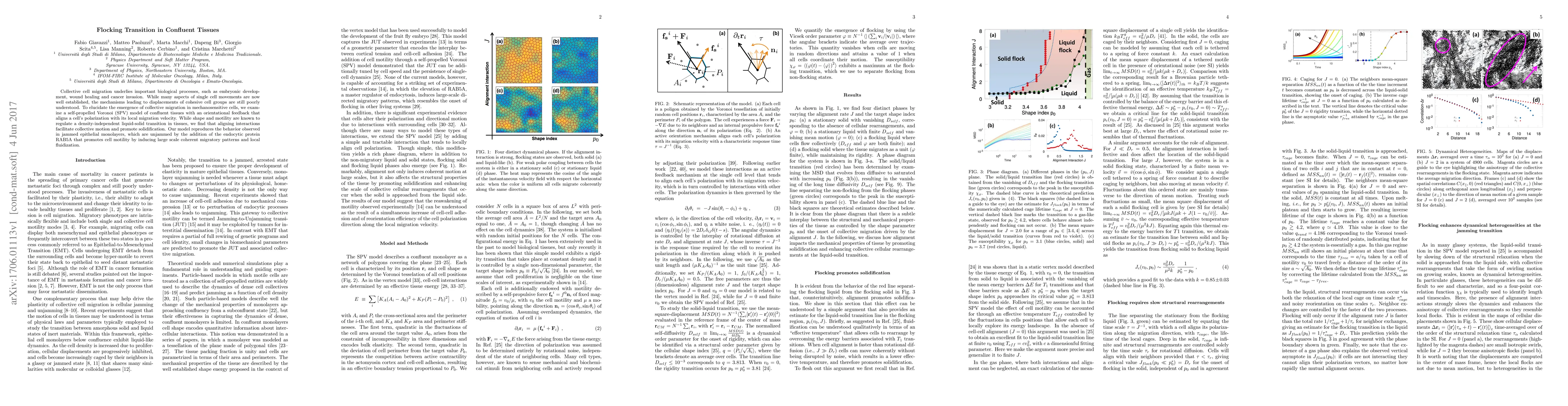 This paper investigates the mechanisms behind collective cell migration in confluent tissues using a self-propelled Voronoi model, revealing that orientational feedback promoting alignment between cell polarization and local migration velocity facilitates collective motion and solidification. The study demonstrates that the addition of RAB5A can induce large-scale coherent migratory patterns and local fluidization in jammed epithelial monolayers.