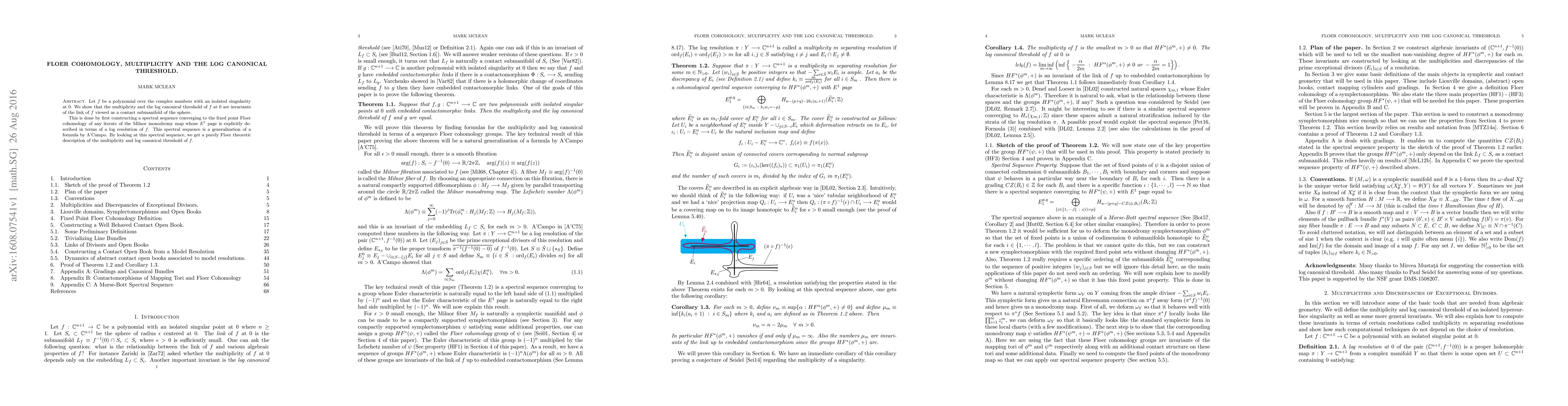 Let f be a polynomial over the complex numbers with an isolated singularity at 0. We show that the multiplicity and the log canonical threshold of f at 0 are invariants of the link of f viewed as a contact submanifold of the sphere. This is done by first constructing a spectral sequence converging to the fixed point Floer cohomology of any iterate of the Milnor monodromy map whose E^1 page is explicitly described in terms of a log resolution of f. This spectral sequence is a generalization of a formula by A'Campo. By looking at this spectral sequence, we get a purely Floer theoretic description of the multiplicity and log canonical threshold of f.