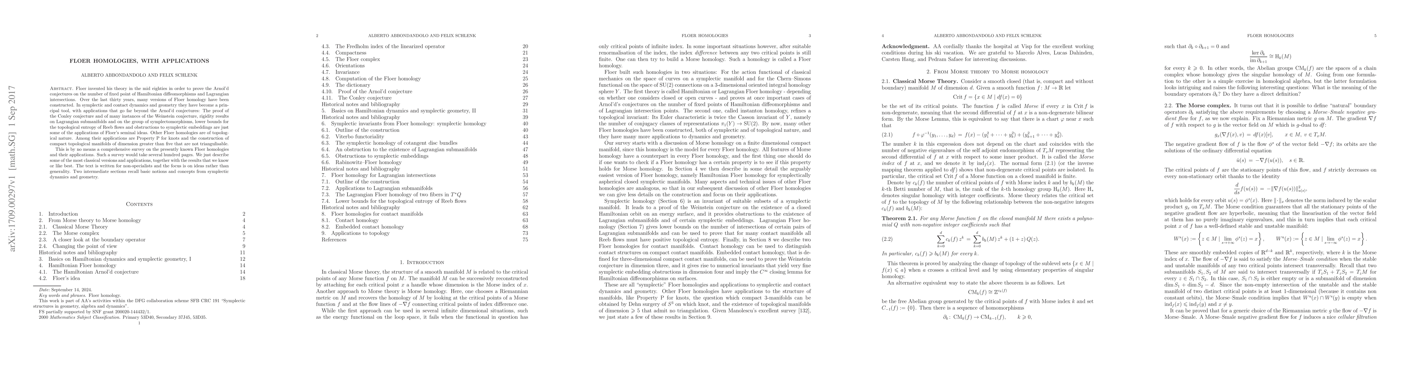Floer homology, initially developed to address Arnol'd conjectures on Hamiltonian systems, has evolved into a fundamental tool in symplectic and contact geometry, proving various conjectures and yielding significant rigidity results. Its applications extend beyond mathematics into knot theory and the construction of non-triangulable manifolds.