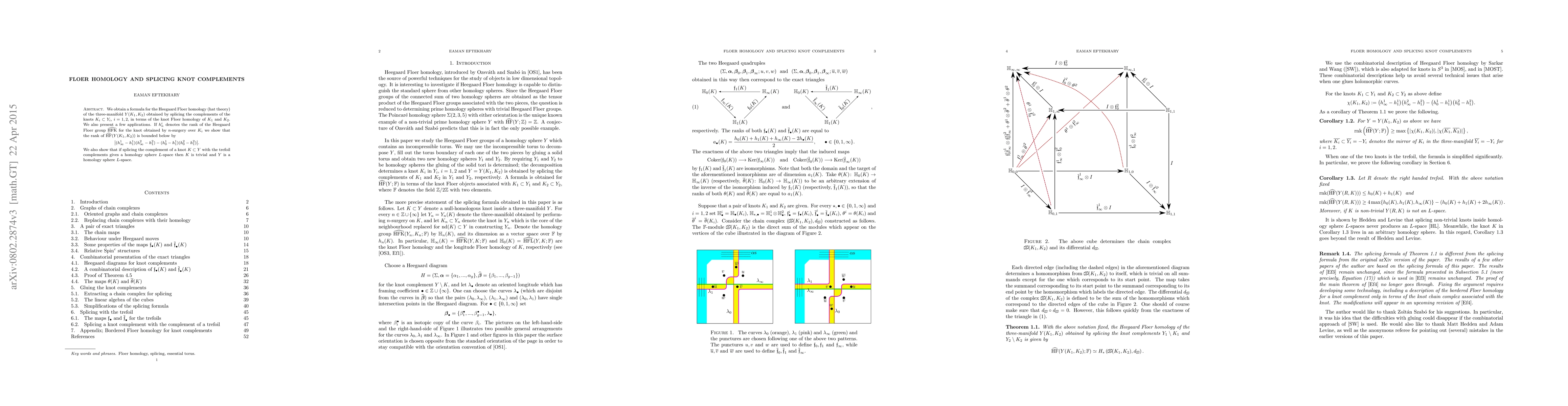 We obtain a formula for the Heegaard Floer homology (hat theory) of the three-manifold $Y(K_1,K_2)$ obtained by splicing the complements of the knots $K_i\subset Y_i$, $i=1,2$, in terms of the knot Floer homology of $K_1$ and $K_2$. We also present a few applications. If $h_n^i$ denotes the rank of the Heegaard Floer group $\widehat{\mathrm{HFK}}$ for the knot obtained by $n$-surgery over $K_i$ we show that the rank of $\widehat{\mathrm{HF}}(Y(K_1,K_2))$ is bounded below by $$\big|(h_\infty^1-h_1^1)(h_\infty^2-h_1^2)- (h_0^1-h_1^1)(h_0^2-h_1^2)\big|.$$ We also show that if splicing the complement of a knot $K\subset Y$ with the trefoil complements gives a homology sphere $L$-space then $K$ is trivial and $Y$ is a homology sphere $L$-space.