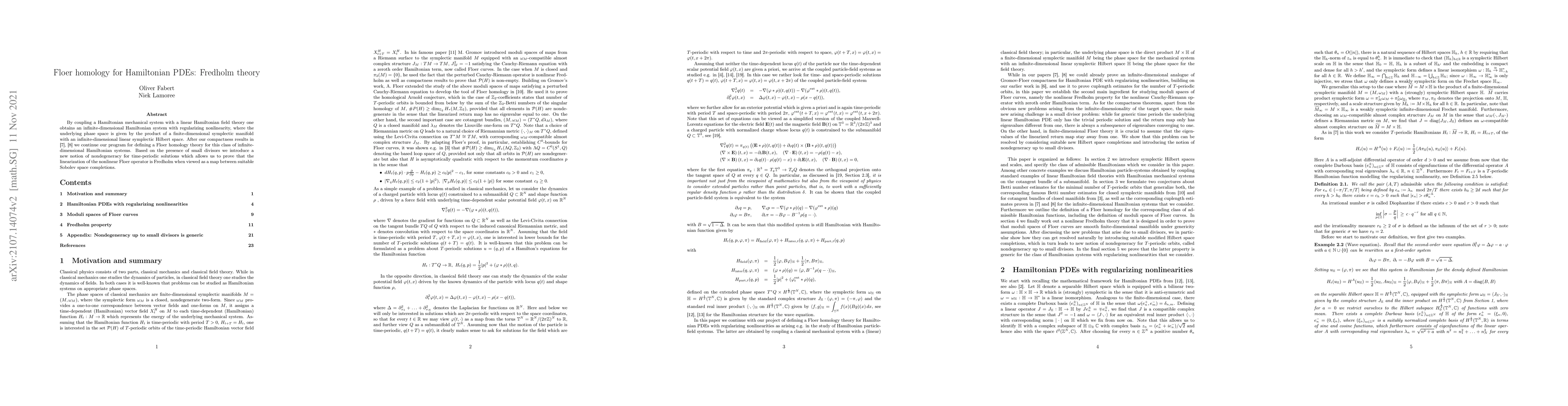This paper develops a Floer homology theory for infinite-dimensional Hamiltonian PDEs by introducing a new notion of nondegeneracy for time-periodic solutions, proving that the linearization of the Floer operator is Fredholm in suitable Sobolev spaces.