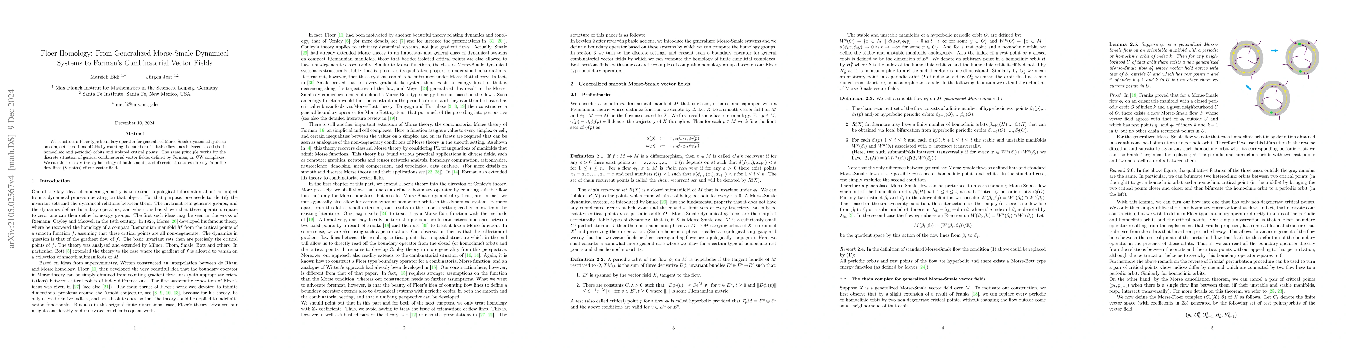 This paper constructs a Floer-type boundary operator for generalized Morse-Smale dynamical systems and Forman's combinatorial vector fields, enabling the recovery of $\mathbb{Z}_2$ homology from flow lines between critical points. This method applies to both smooth manifolds and discrete CW complexes.