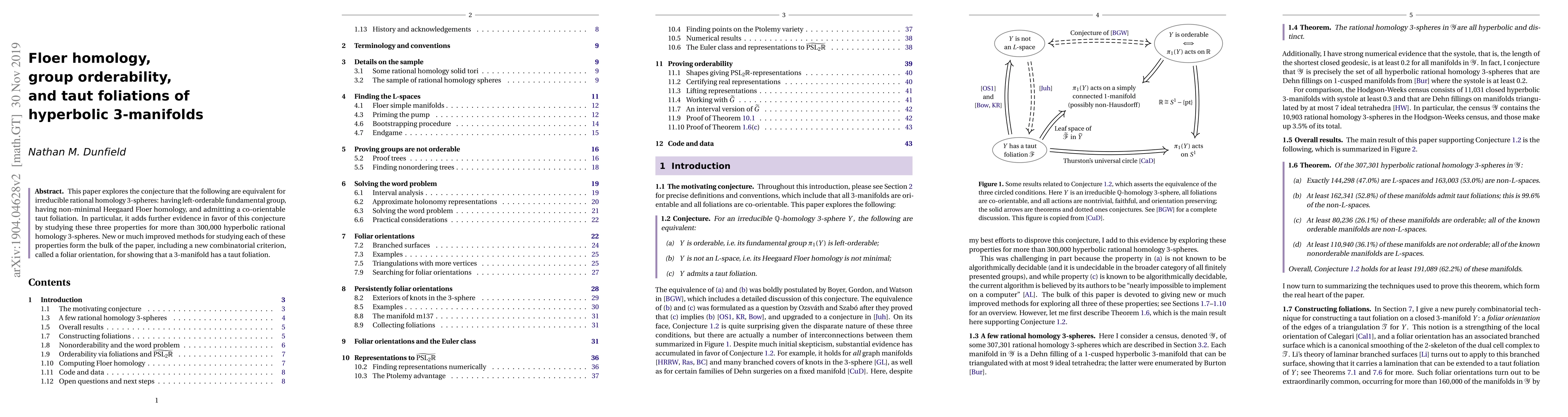 This paper explores the conjecture that the following are equivalent for rational homology 3-spheres: having left-orderable fundamental group, having non-minimal Heegaard Floer homology, and admitting a co-orientable taut foliation. In particular, it adds further evidence in favor of this conjecture by studying these three properties for more than 300,000 hyperbolic rational homology 3-spheres. New or much improved methods for studying each of these properties form the bulk of the paper, including a new combinatorial criterion, called a foliar orientation, for showing that a 3-manifold has a taut foliation.