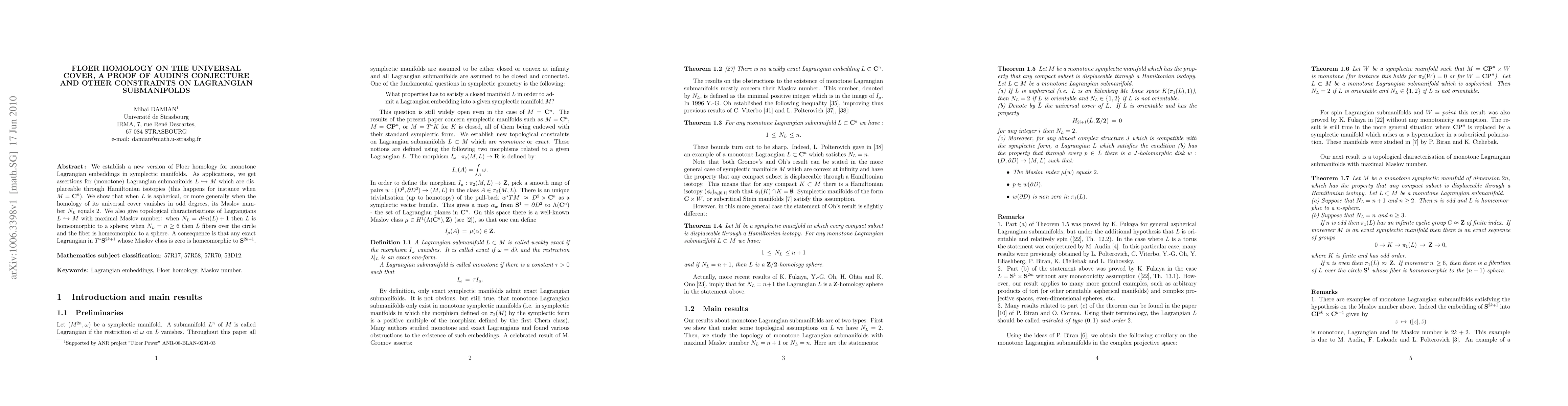 This paper introduces a new version of Floer homology for monotone Lagrangian submanifolds, proving a generalized version of Audin's conjecture that the Maslov number of an aspherical manifold embedded in ${\bf C^{n}}$ is $2$. It also explores additional topological constraints on displaceable Lagrangian submanifolds of maximal Maslov number.