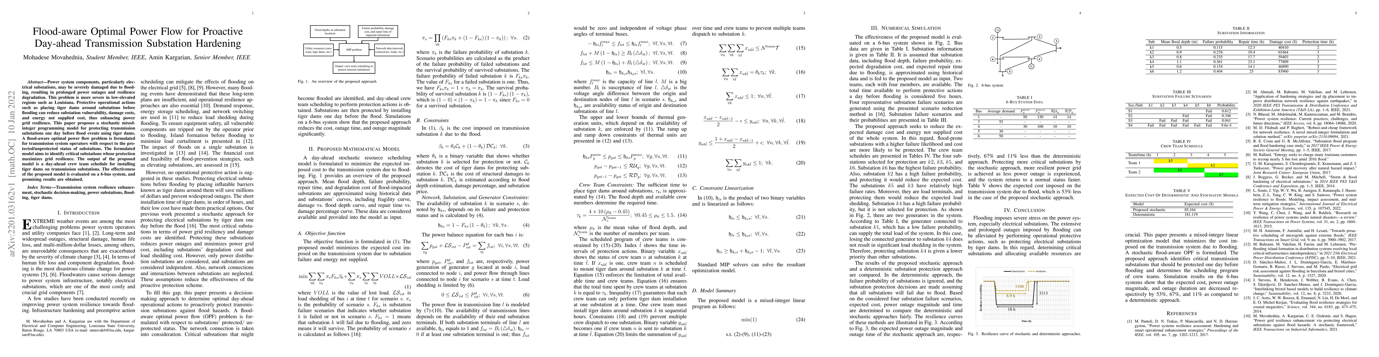 This paper proposes a stochastic mixed-integer programming model for preemptively protecting transmission substations from flood damage using tiger dams, optimizing power flow for enhanced grid resilience. The model identifies critical substations for protection and generates day-ahead crew schedules for dam installation, demonstrating effectiveness on a 6-bus system.