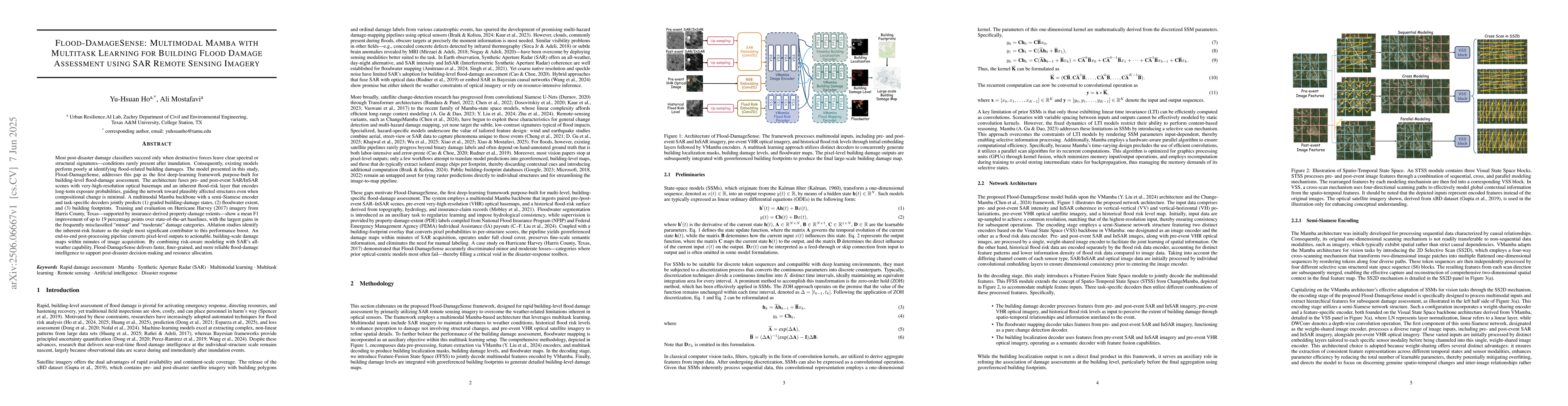 Most post-disaster damage classifiers succeed only when destructive forces leave clear spectral or structural signatures -- conditions rarely present after inundation. Consequently, existing models perform poorly at identifying flood-related building damages. The model presented in this study, Flood-DamageSense, addresses this gap as the first deep-learning framework purpose-built for building-level flood-damage assessment. The architecture fuses pre- and post-event SAR/InSAR scenes with very-high-resolution optical basemaps and an inherent flood-risk layer that encodes long-term exposure probabilities, guiding the network toward plausibly affected structures even when compositional change is minimal. A multimodal Mamba backbone with a semi-Siamese encoder and task-specific decoders jointly predicts (1) graded building-damage states, (2) floodwater extent, and (3) building footprints. Training and evaluation on Hurricane Harvey (2017) imagery from Harris County, Texas -- supported by insurance-derived property-damage extents -- show a mean F1 improvement of up to 19 percentage points over state-of-the-art baselines, with the largest gains in the frequently misclassified "minor" and "moderate" damage categories. Ablation studies identify the inherent-risk feature as the single most significant contributor to this performance boost. An end-to-end post-processing pipeline converts pixel-level outputs to actionable, building-scale damage maps within minutes of image acquisition. By combining risk-aware modeling with SAR's all-weather capability, Flood-DamageSense delivers faster, finer-grained, and more reliable flood-damage intelligence to support post-disaster decision-making and resource allocation.