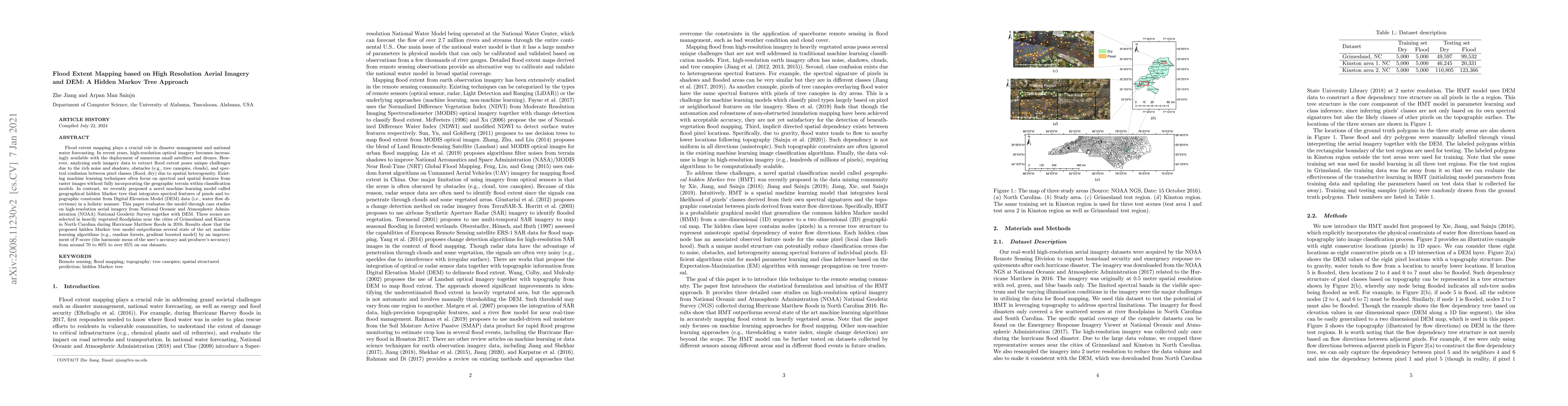 This paper proposes a geographical hidden Markov tree model for flood extent mapping using high-resolution aerial imagery and DEM data, achieving superior performance in flood detection compared to traditional machine learning algorithms, with an F-score improvement from around 70% to over 95%.