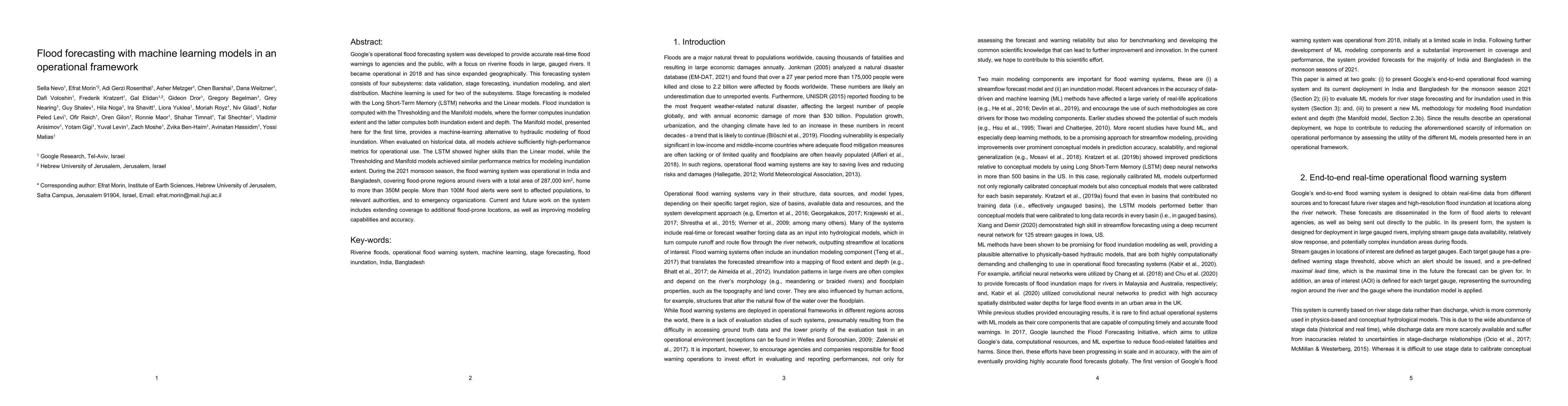 Google's operational flood forecasting system uses machine learning models, including LSTM networks and Linear models, to provide real-time flood warnings for riverine floods in large gauged rivers. The system achieved high performance metrics and successfully issued over 100 million alerts in 2021, covering 287,000 km² in India and Bangladesh.