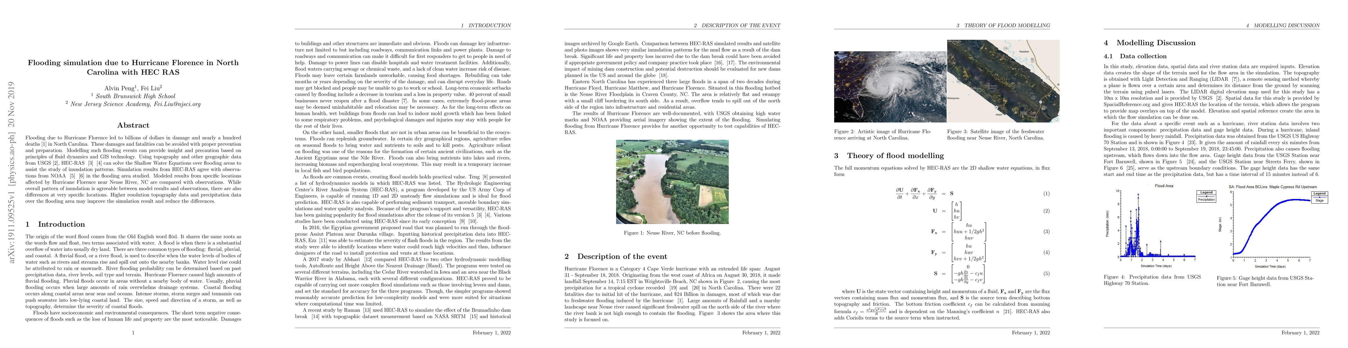 A study using HEC-RAS software simulated flooding from Hurricane Florence in North Carolina, finding agreement with NOAA observations but also areas for improvement with higher resolution data.