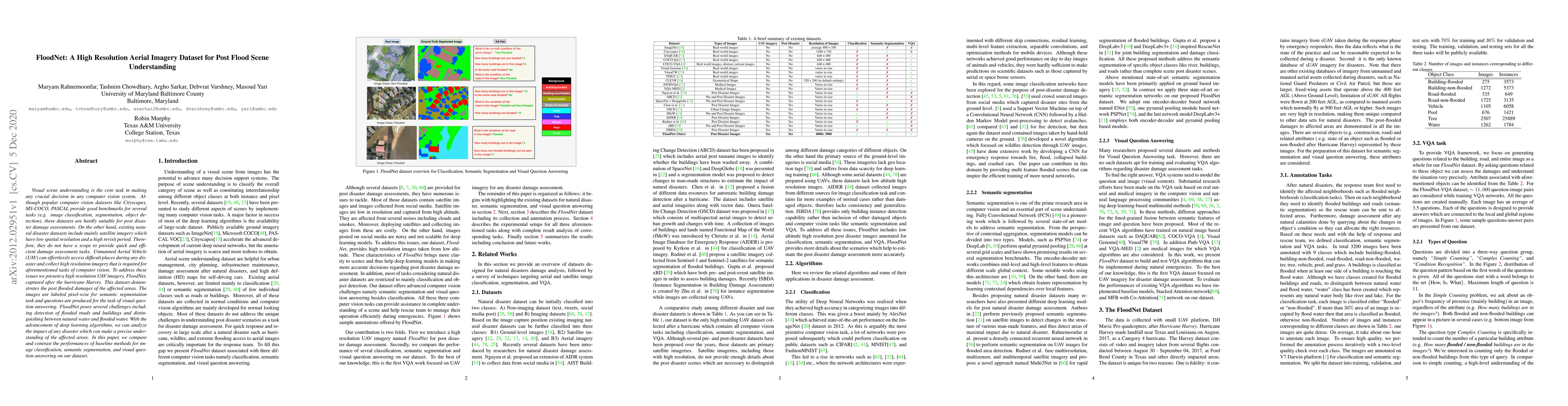 Visual scene understanding is the core task in making any crucial decision in any computer vision system. Although popular computer vision datasets like Cityscapes, MS-COCO, PASCAL provide good benchmarks for several tasks (e.g. image classification, segmentation, object detection), these datasets are hardly suitable for post disaster damage assessments. On the other hand, existing natural disaster datasets include mainly satellite imagery which have low spatial resolution and a high revisit period. Therefore, they do not have a scope to provide quick and efficient damage assessment tasks. Unmanned Aerial Vehicle(UAV) can effortlessly access difficult places during any disaster and collect high resolution imagery that is required for aforementioned tasks of computer vision. To address these issues we present a high resolution UAV imagery, FloodNet, captured after the hurricane Harvey. This dataset demonstrates the post flooded damages of the affected areas. The images are labeled pixel-wise for semantic segmentation task and questions are produced for the task of visual question answering. FloodNet poses several challenges including detection of flooded roads and buildings and distinguishing between natural water and flooded water. With the advancement of deep learning algorithms, we can analyze the impact of any disaster which can make a precise understanding of the affected areas. In this paper, we compare and contrast the performances of baseline methods for image classification, semantic segmentation, and visual question answering on our dataset.