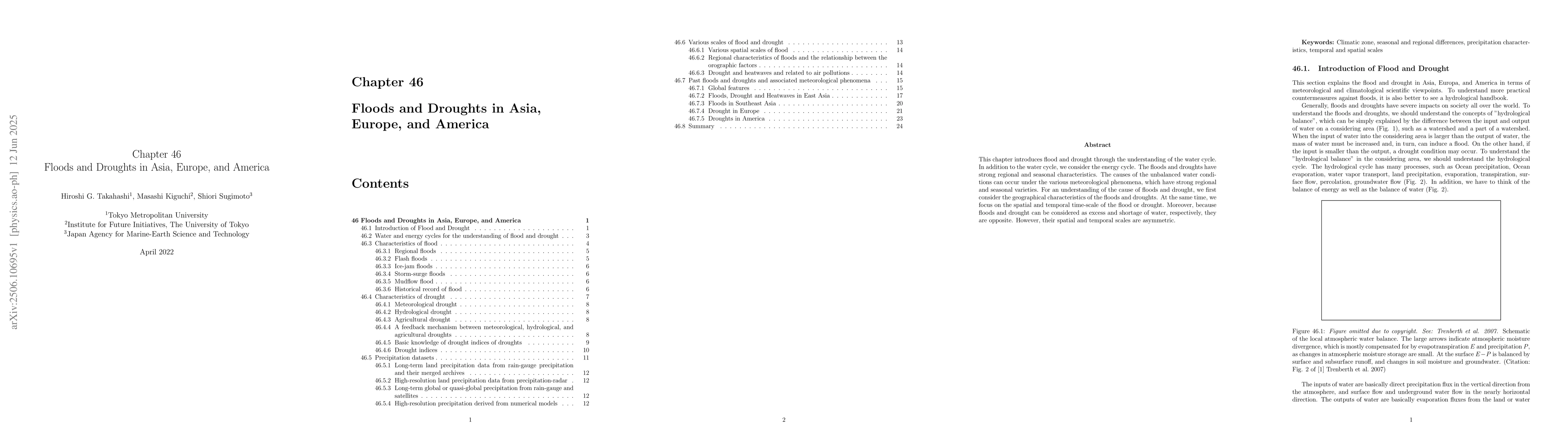 This chapter introduces flood and drought through the understanding of the water cycle. In addition to the water cycle, we consider the energy cycle. The floods and droughts have strong regional and seasonal characteristics. The causes of the unbalanced water conditions can occur under the various meteorological phenomena, which have strong regional and seasonal varieties. For an understanding of the cause of floods and drought, we first consider the geographical characteristics of the floods and droughts. At the same time, we focus on the spatial and temporal time-scale of the flood or drought. Moreover, because floods and drought can be considered as excess and shortage of water, respectively, they are opposite. However, their spatial and temporal scales are asymmetric.