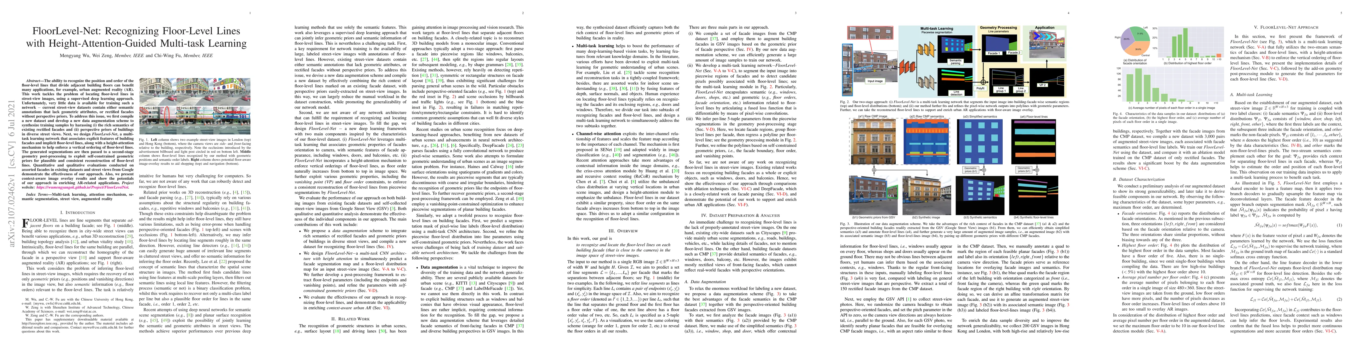 FloorLevel-Net employs height-attention-guided multi-task learning to recognize floor-level lines in street-view images, addressing the scarcity of training data by synthesizing samples from rectified facades and street views. The network's effectiveness is demonstrated through improved urban augmented reality applications.