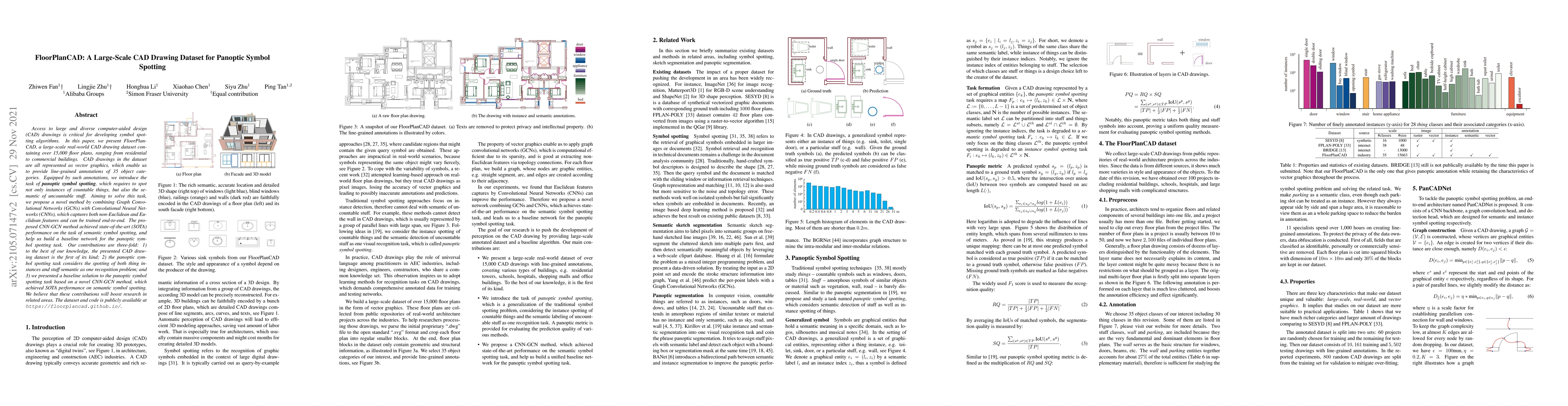 FloorPlanCAD, a large-scale CAD drawing dataset with over 10,000 floor plans and fine-grained annotations, enables panoptic symbol spotting. The proposed CNN-GCN method achieved state-of-the-art performance, introducing a new baseline for the panoptic symbol spotting task.