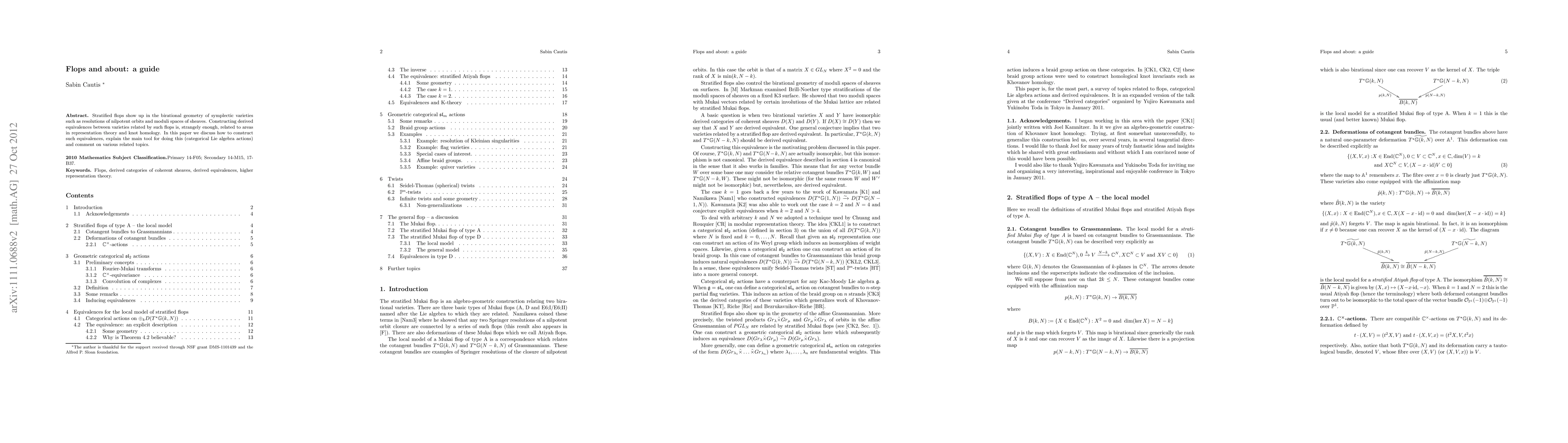 Stratified flops show up in the birational geometry of symplectic varieties such as resolutions of nilpotent orbits and moduli spaces of sheaves. Constructing derived equivalences between varieties related by such flops is, strangely enough, related to areas in representation theory and knot homology. In this paper we discuss how to construct such equivalences, explain the main tool for doing this (categorical Lie algebra actions) and comment on various related topics.