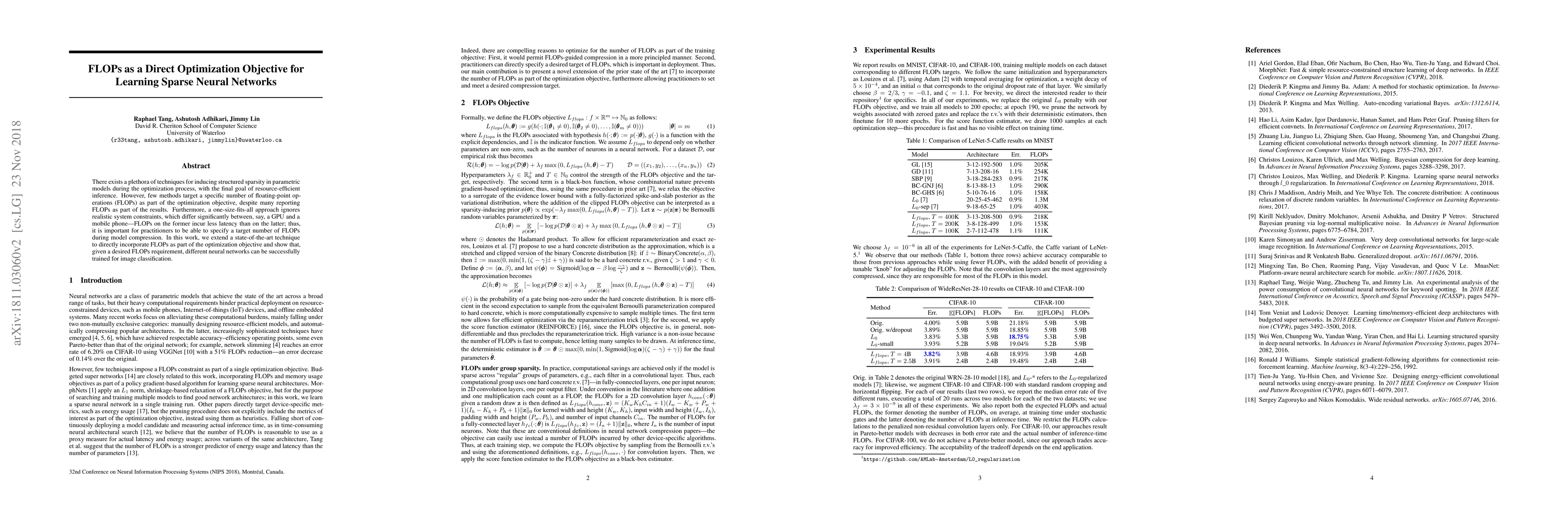 There exists a plethora of techniques for inducing structured sparsity in parametric models during the optimization process, with the final goal of resource-efficient inference. However, few methods target a specific number of floating-point operations (FLOPs) as part of the optimization objective, despite many reporting FLOPs as part of the results. Furthermore, a one-size-fits-all approach ignores realistic system constraints, which differ significantly between, say, a GPU and a mobile phone -- FLOPs on the former incur less latency than on the latter; thus, it is important for practitioners to be able to specify a target number of FLOPs during model compression. In this work, we extend a state-of-the-art technique to directly incorporate FLOPs as part of the optimization objective and show that, given a desired FLOPs requirement, different neural networks can be successfully trained for image classification.