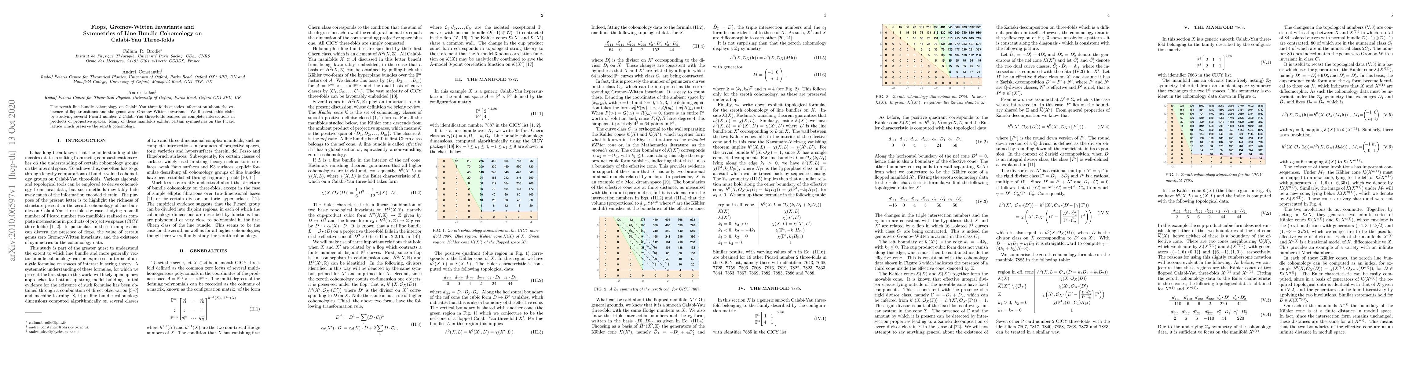 This paper investigates how zeroth line bundle cohomology on Calabi-Yau three-folds relates to flop transitions and Gromov-Witten invariants, demonstrating these connections through analysis of specific complete intersections in projective space with Picard number 2. It reveals symmetries on the Picard lattice that maintain zeroth cohomology.