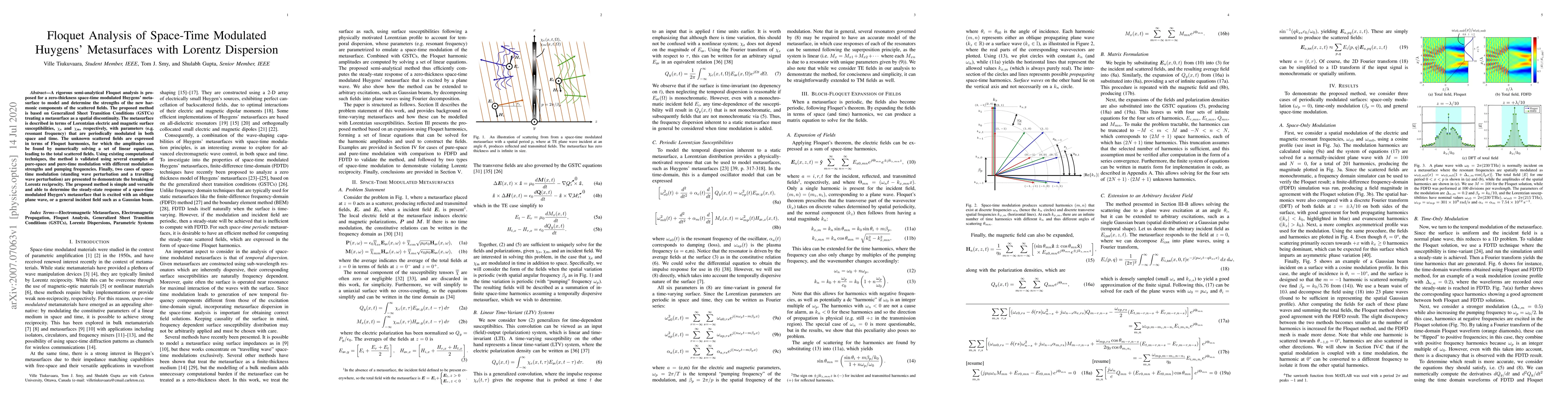 Researchers develop a method to analyze space-time modulated Huygens' metasurfaces using Floquet analysis, enabling the study of harmonic components and breaking of Lorentz reciprocity in metamaterials.