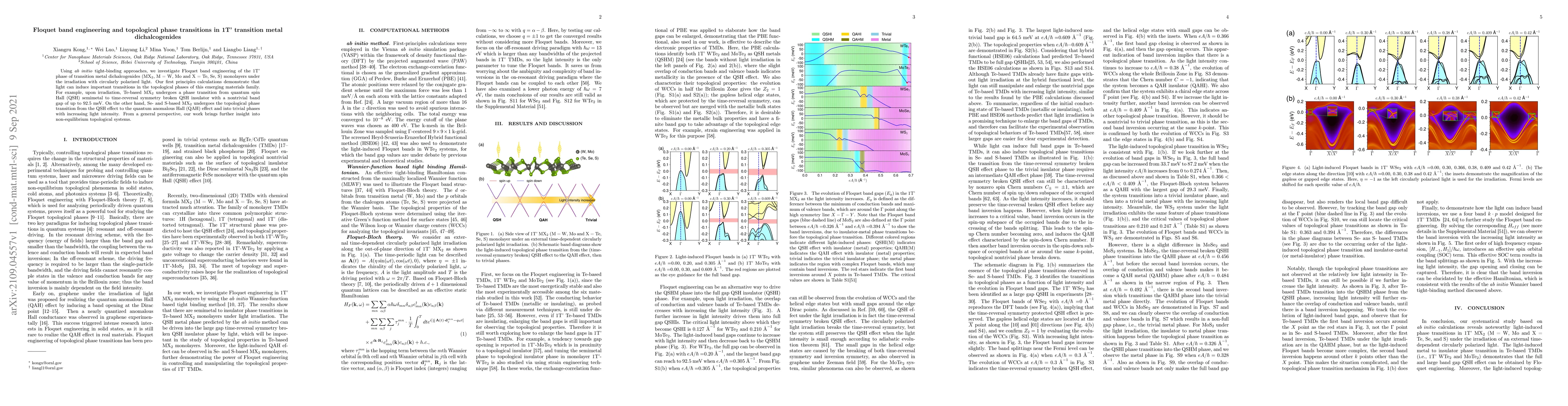 This paper explores how circularly polarized light can induce topological phase transitions in 1T' phase transition metal dichalcogenides using ab initio tight-binding methods. It reveals that different dichalcogenides (MX2) undergo distinct transitions, such as from quantum spin Hall semimetal to insulator or from quantum spin Hall to quantum anomalous Hall effects, depending on the material composition and light intensity.