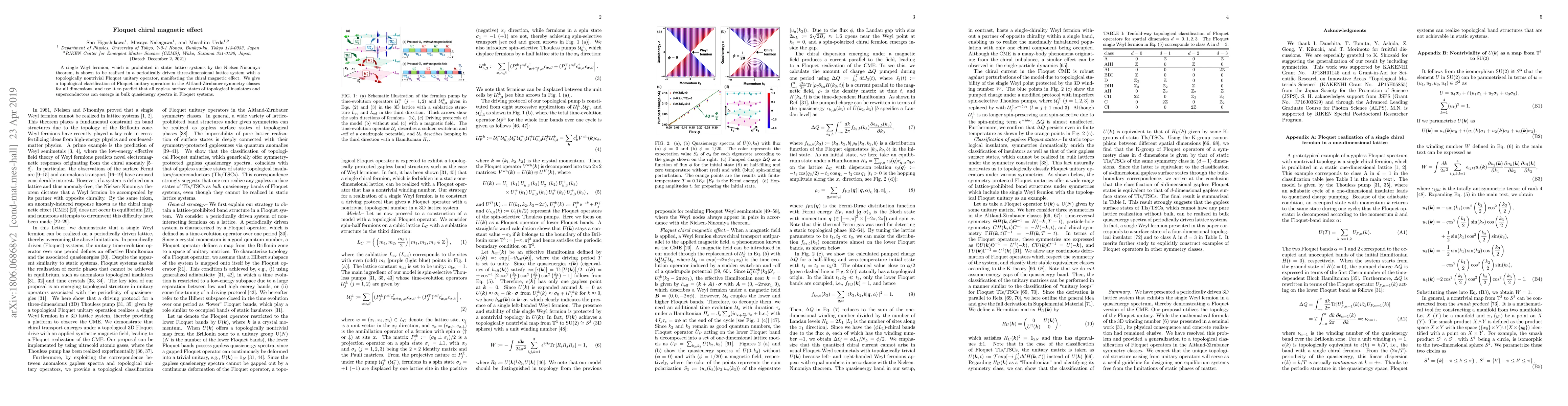 A single Weyl fermion, which is prohibited in static lattice systems by the Nielsen-Ninomiya theorem, is shown to be realized in a periodically driven three-dimensional lattice system with a topologically nontrivial Floquet unitary operator, manifesting the chiral magnetic effect. We give a topological classification of Floquet unitary operators in the Altland-Zirnbauer symmetry classes for all dimensions, and use it to predict that all gapless surface states of topological insulators and superconductors can emerge in bulk quasienergy spectra in Floquet systems.