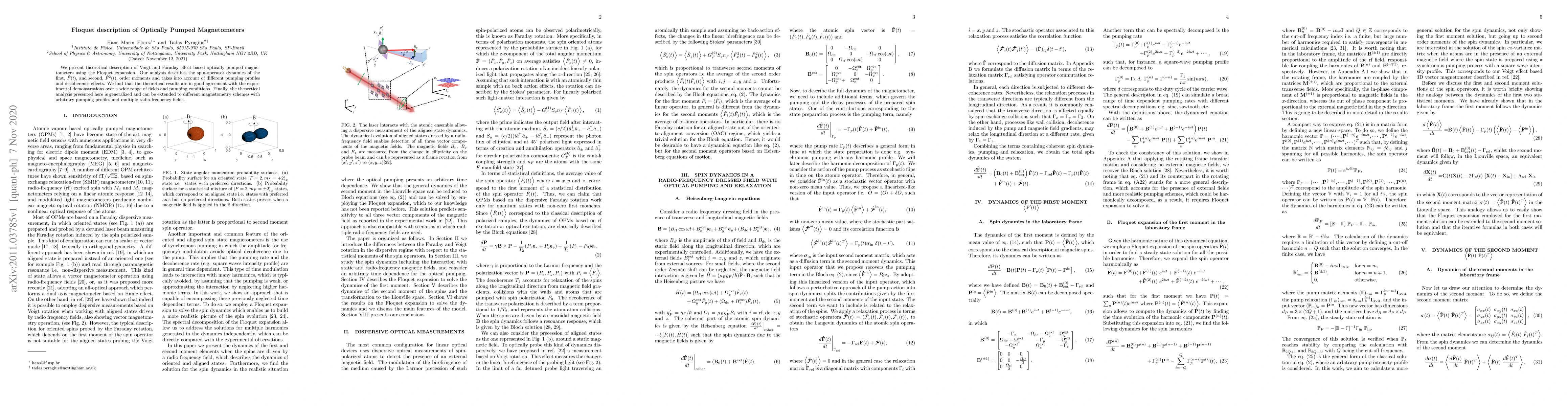 We present theoretical description of Voigt and Faraday effect based optically pumped magnetometers using the Floquet expansion. Our analysis describes the spin-operator dynamics of the first, $\hat{F}(t)$, and second, $\hat{F}^2(t)$, order moments and takes into account of different pumping profiles and decoherence effects. We find that the theoretical results are in good agreement with the experimental demonstrations over a wide range of fields and pumping conditions. Finally, the theoretical analysis presented here is generalized and can be extended to different magnetometry schemes with arbitrary pumping profiles and multiple radio-frequency fields.